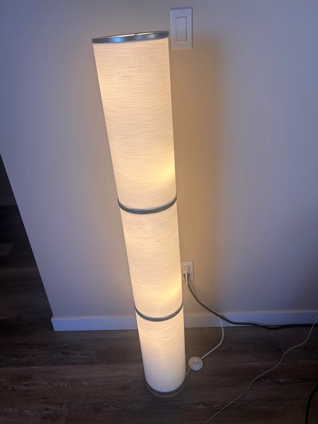 This is a modern cylinder floor lamp that gives off a nice ambient light. It would look great in any living room or bedroom! It features a white fabric shade with silver accents.
