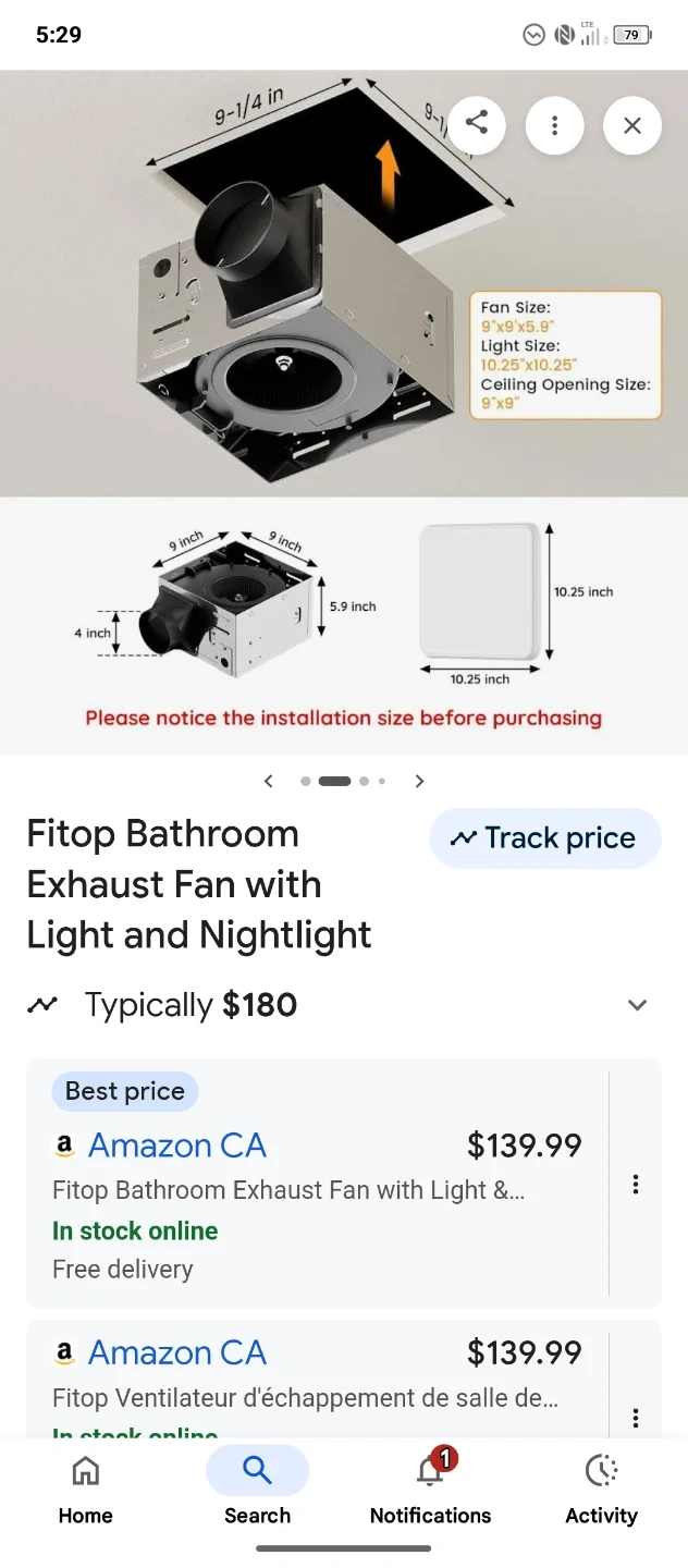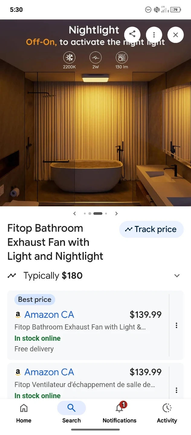 Fitop bathroom exhaust fan comes with a light and nightlight feature. It offers 110 CFM and 1300 LM LED light with selectable colour temperatures. The fan itself is 1.0 Sones and ultra-quiet. Included is the original box with components.