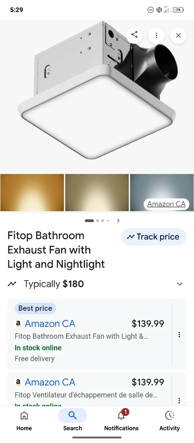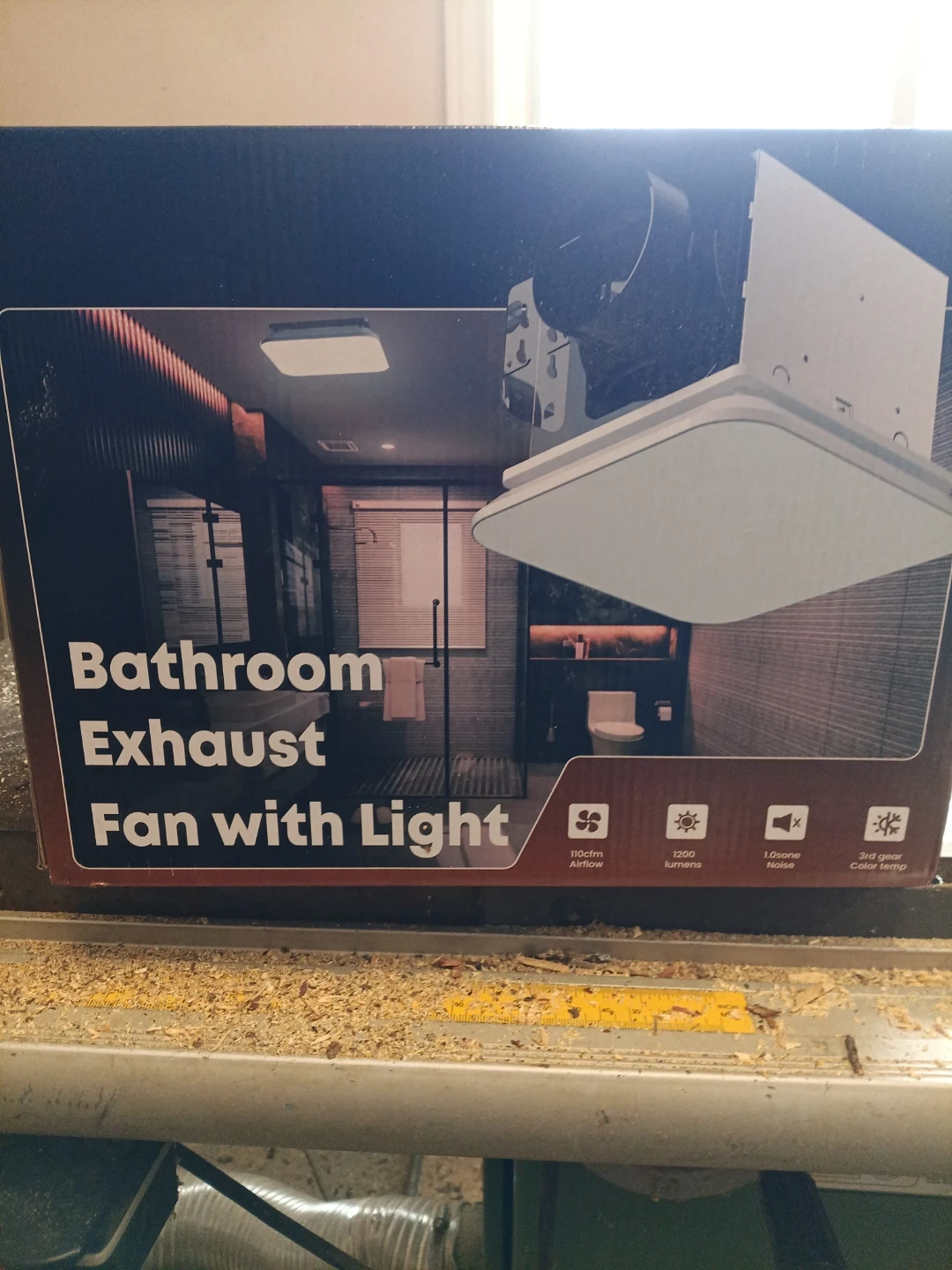 Fitop bathroom exhaust fan comes with a light and nightlight feature. It offers 110 CFM and 1300 LM LED light with selectable colour temperatures. The fan itself is 1.0 Sones and ultra-quiet. Included is the original box with components.
