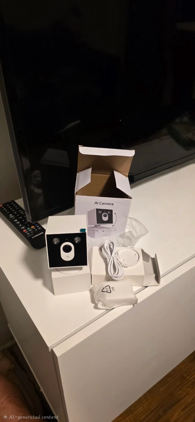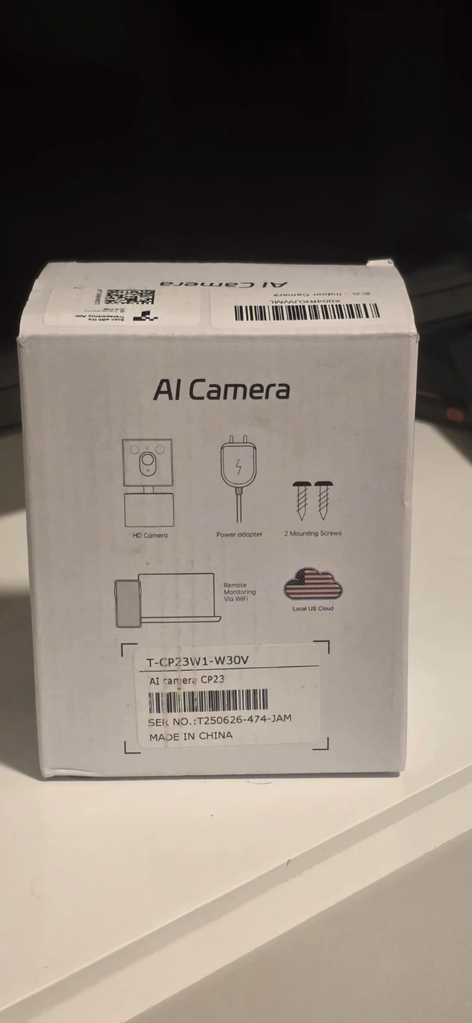 Selling a brand new AI Camera. It comes with all original components, including the power adapter and mounting screws. The model number is T-CP23W1-W30V. It features HD camera, remote monitoring via Wifi, and local US Cloud.
