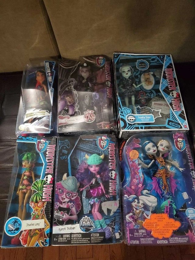I have a selection of Monster High dolls, each with unique characteristics and stylish outfits! These dolls are in new condition, still sealed in their original packaging, ready to be displayed or played with. * Frankie Stein * Clawdeen Wolf * Jinafire Long * Kjersti Trollson * Peri & Pearl Serpentine. $120 Each or OBO. Cash accepted.