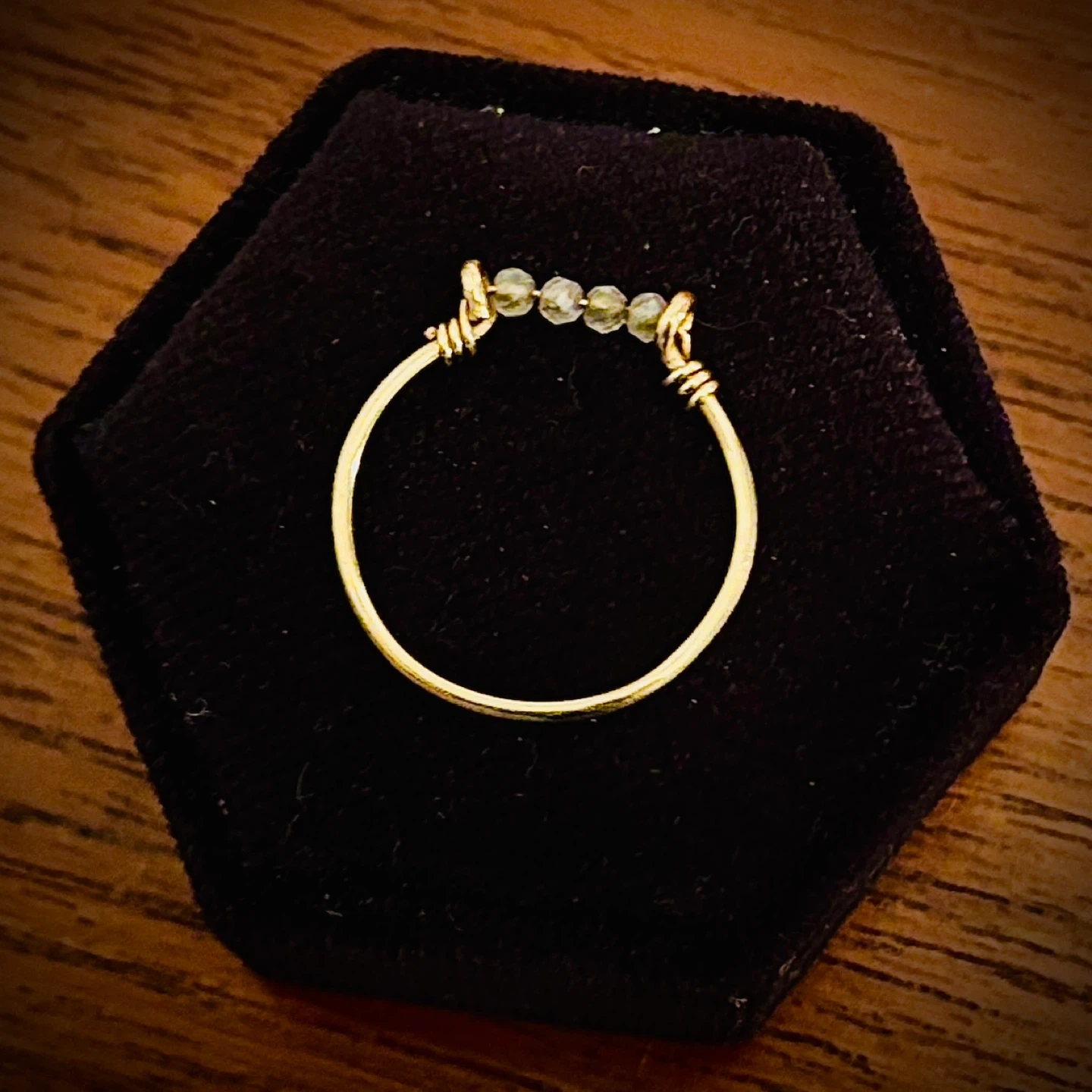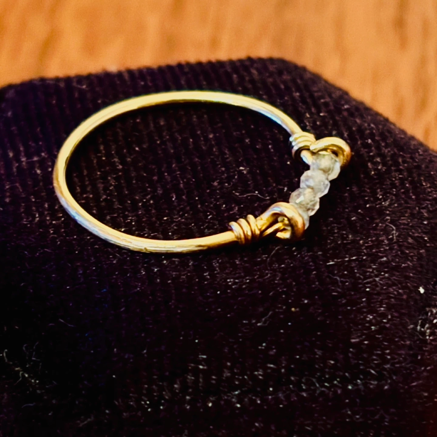 This is a delicate gold-tone wire ring featuring a cluster of sapphire beads. The wire is wrapped to create a simple, elegant design. It's a lovely piece for everyday wear or as a stacking ring. 10k tested. Size 6-6.5, just under 0.6g.
