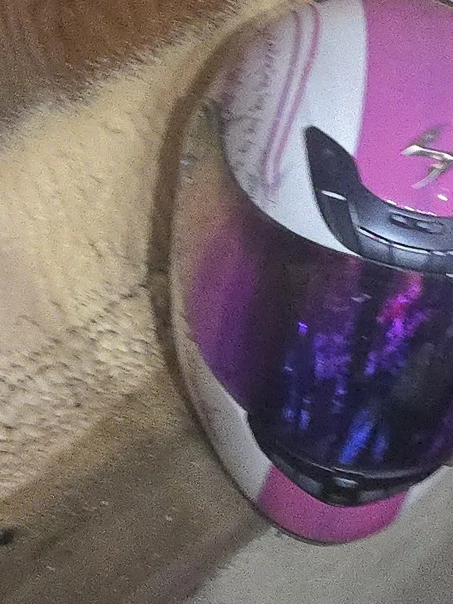 Selling a Scorpion EXO-R420 helmet. It features a pink and white design with a dark visor. Great for motorcycle riders!