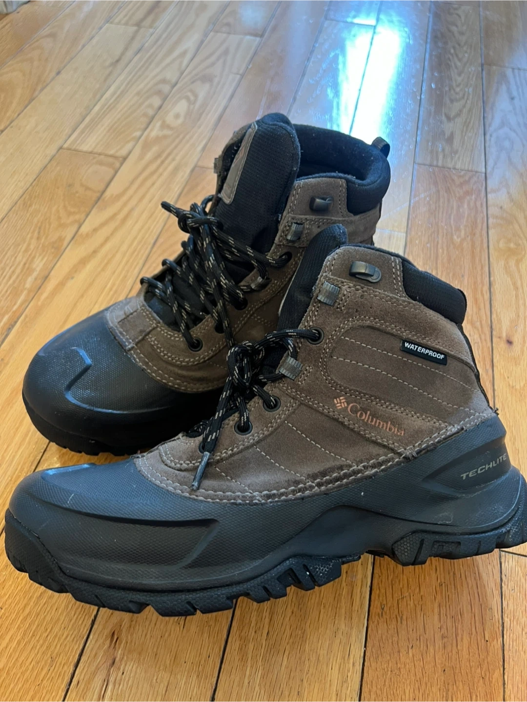 Columbia waterproof winter boots in a men's size 9. They have 200 grams of insulation and a Techlite sole. Made in Vietnam. Great for staying warm and dry during colder weather!