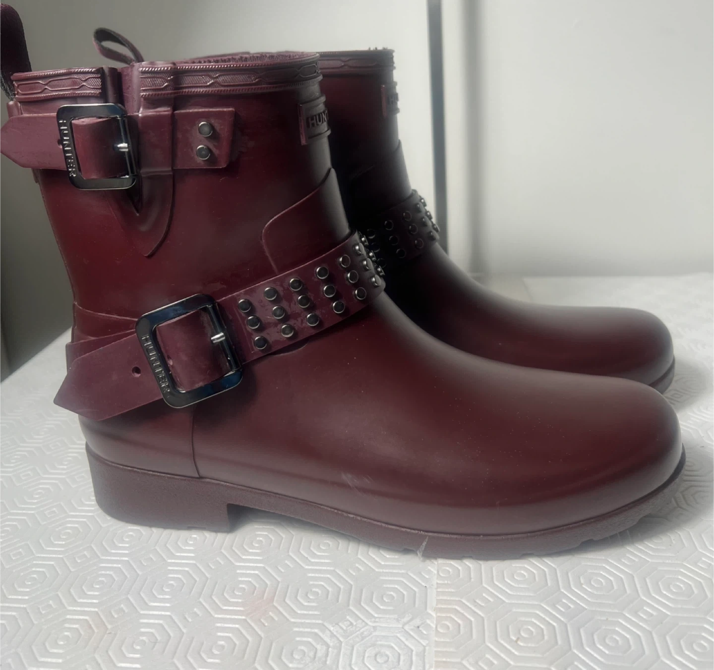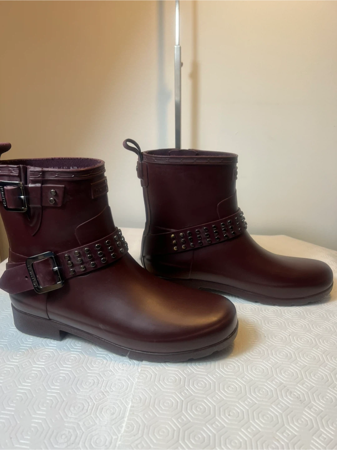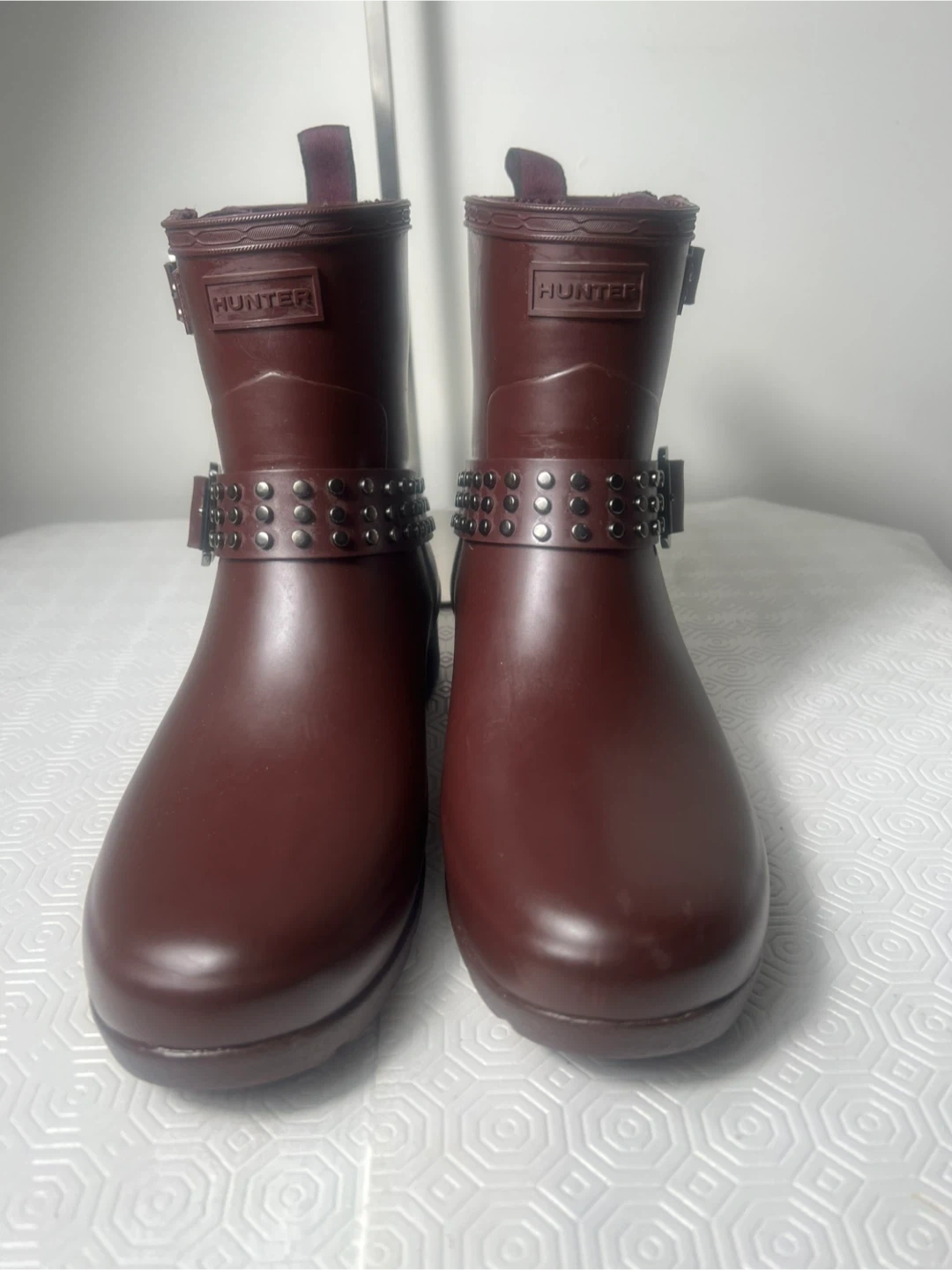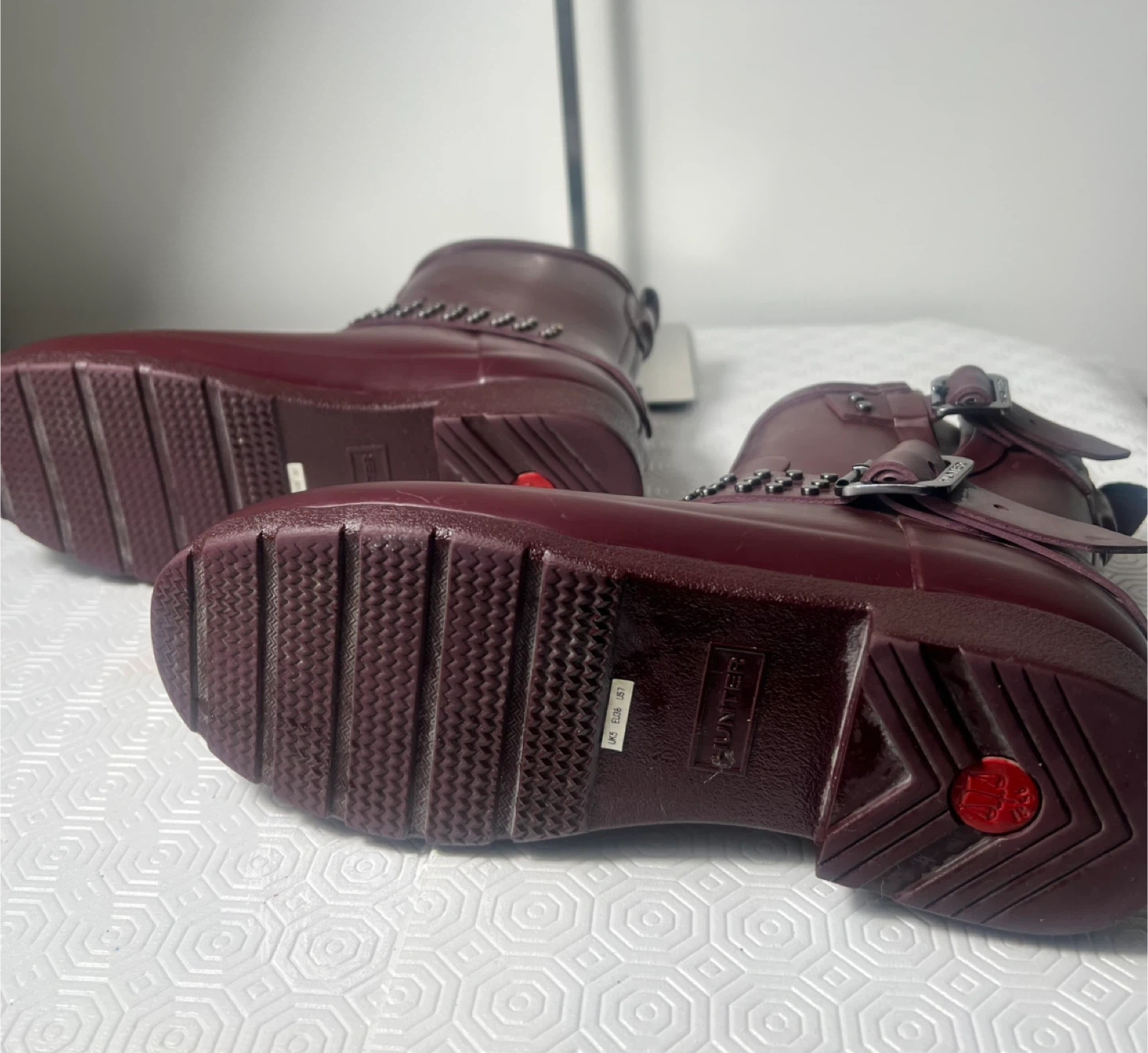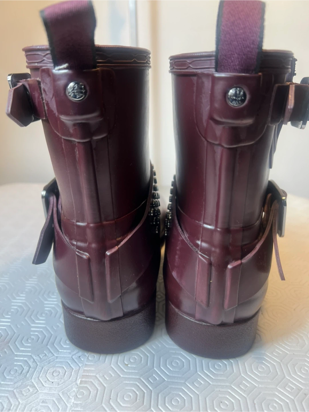 Hunter Burgundy Rubber Boots with Studded Straps Size 7