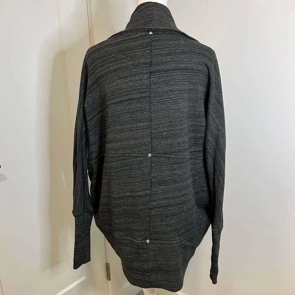 Wilfred Free Cardigan in heather charcoal grey. Open front with studded details. Features a wide ribbed shawl collar, rounded draped hem, and long fitted ribbed cuffs. Made from a soft cotton and modal blend. Classic heathered dark grey knit.