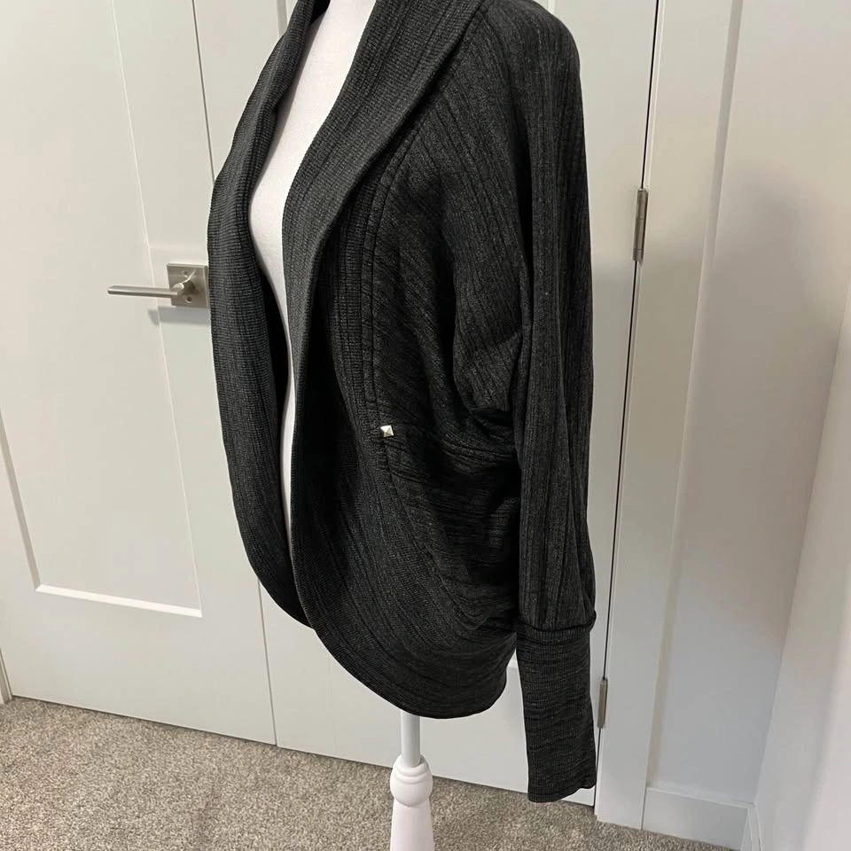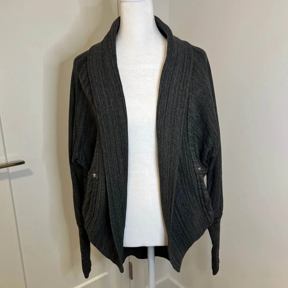 Wilfred Free Cardigan in heather charcoal grey. Open front with studded details. Features a wide ribbed shawl collar, rounded draped hem, and long fitted ribbed cuffs. Made from a soft cotton and modal blend. Classic heathered dark grey knit.