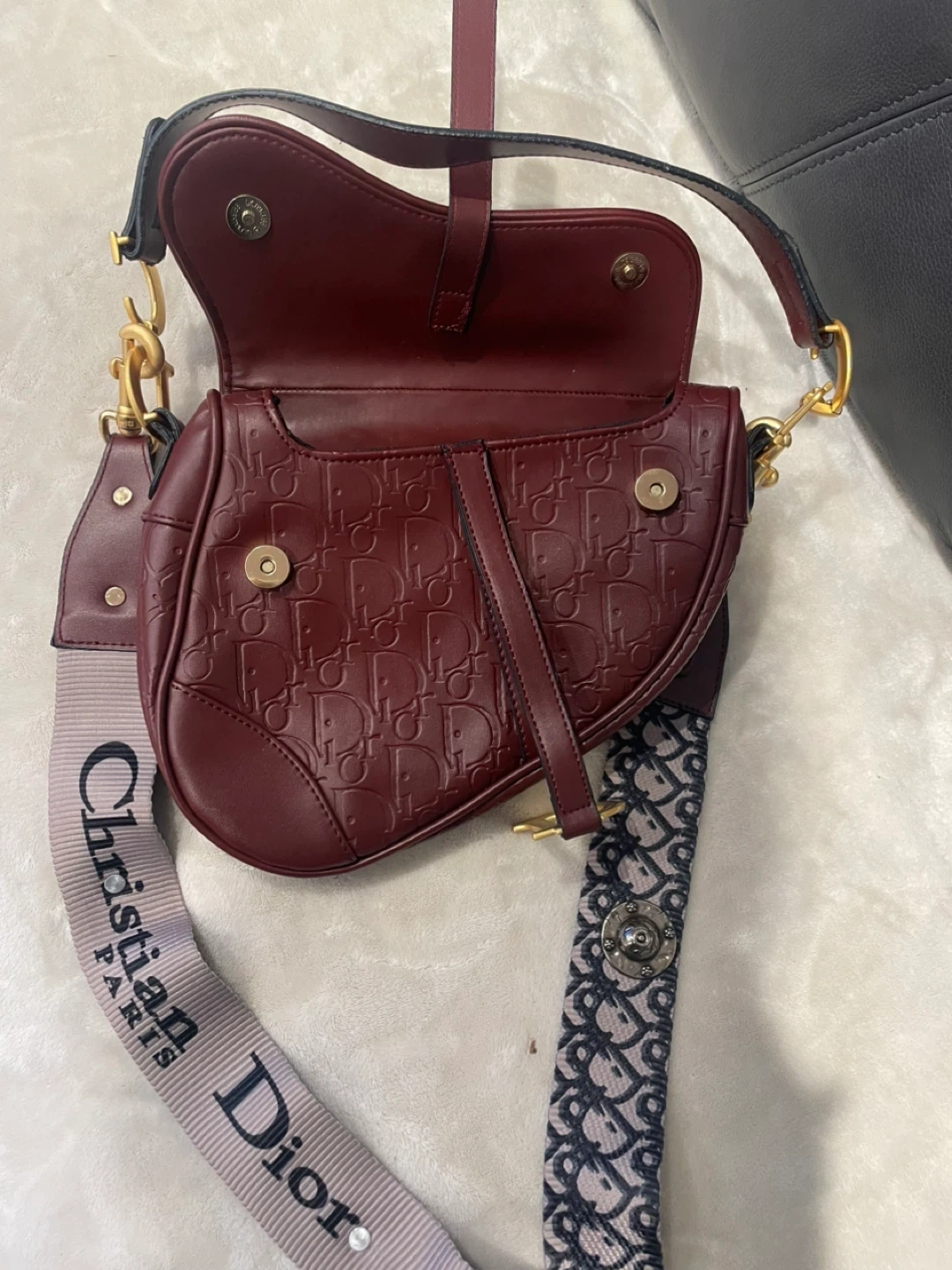 Dior Saddle Bag, featuring a distinctive saddle shape and the iconic Dior Oblique pattern embossed on the leather. The bag comes with a 'Christian Dior Paris' shoulder strap, adding a touch of modern elegance. It's a stylish and recognizable piece, perfect for adding a chic touch to any outfit.