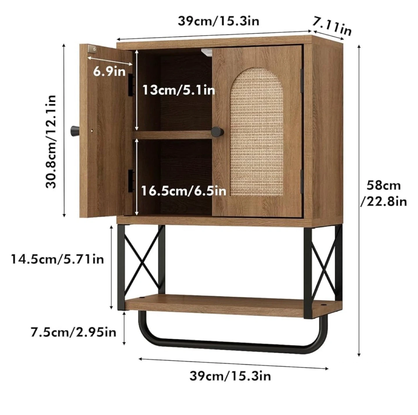 This bathroom wall cabinet features a rustic wood finish with rattan door panels. It has hidden storage cabinets with adjustable shelves and an open lower shelf with a removable towel bar. The overall dimensions are 58cm (H) x 39cm (W) x 18cm (D).