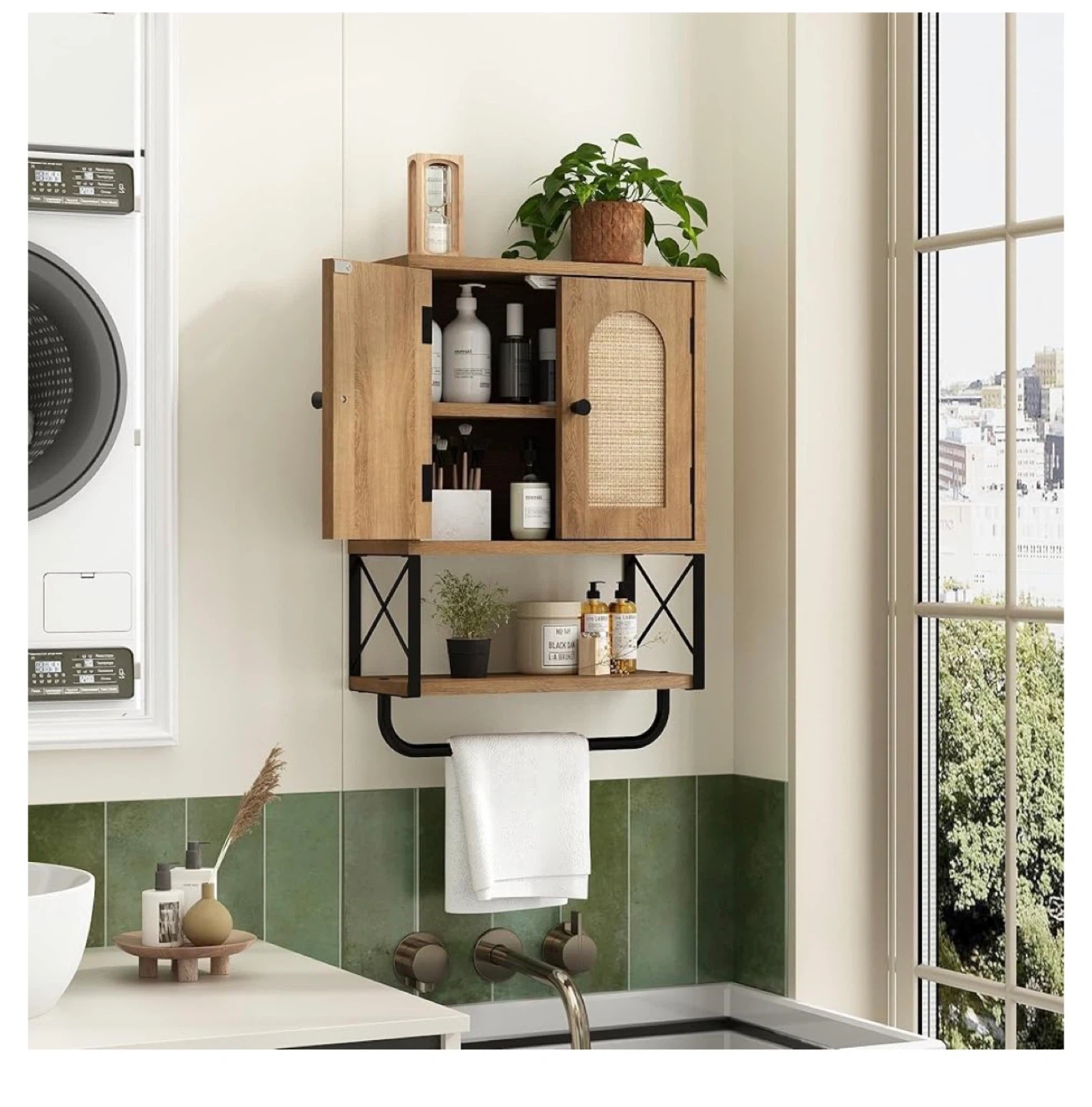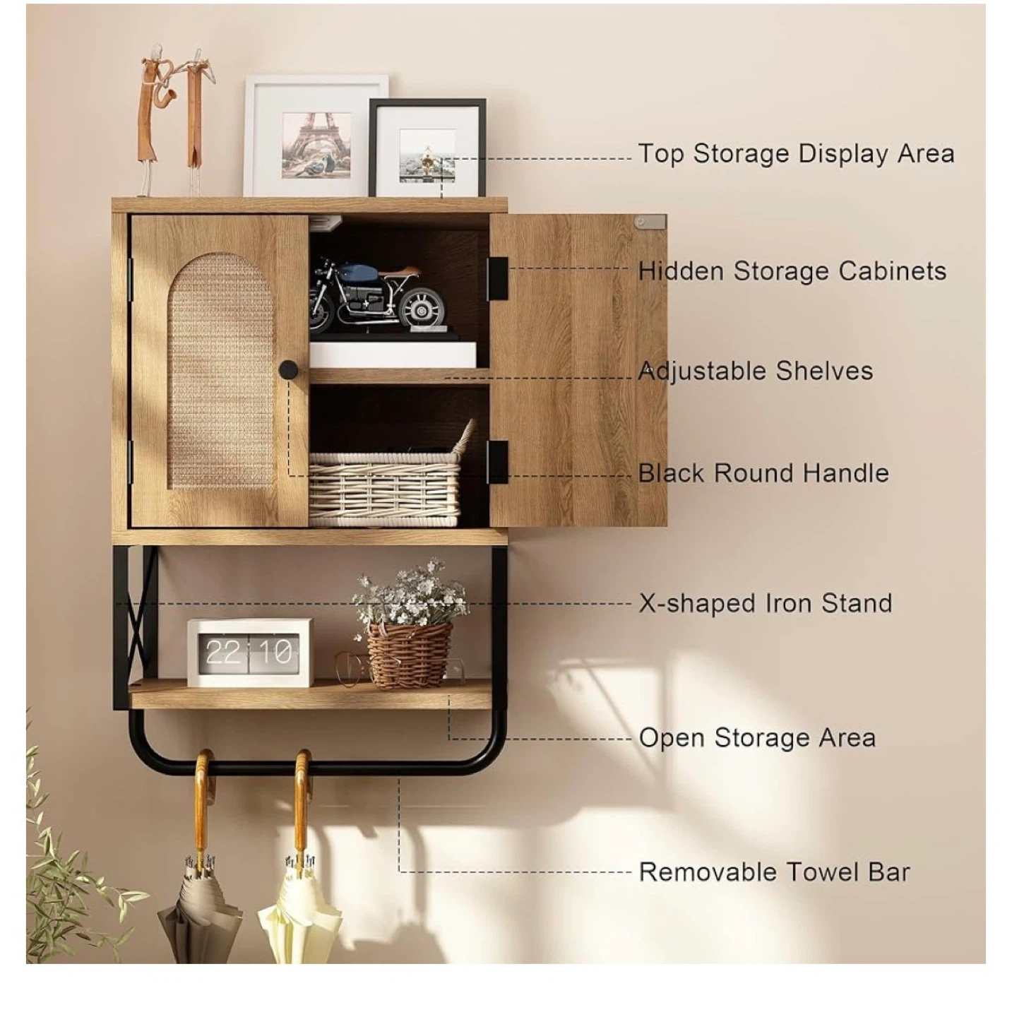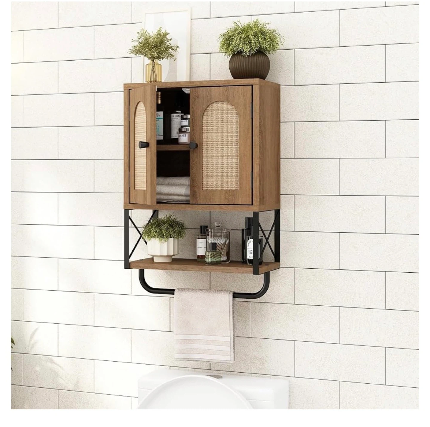 Wood Bathroom Wall Cabinet with Rattan Inlay and Towel Bar