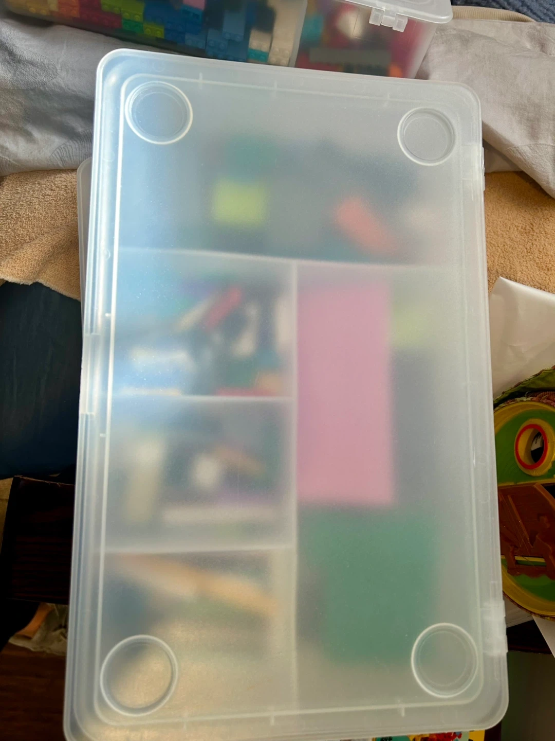 Various Lego pieces. The bin is sold separately for $6. The bin features multiple compartments to help keep the bricks organized. It's great for keeping building pieces tidy!