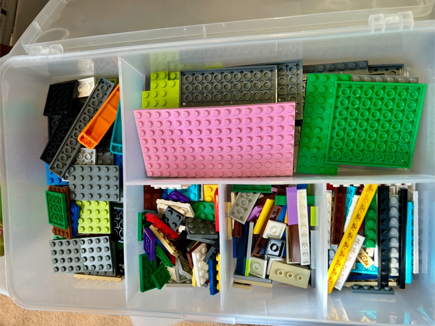 Various Lego pieces. The bin is sold separately for $6. The bin features multiple compartments to help keep the bricks organized. It's great for keeping building pieces tidy!