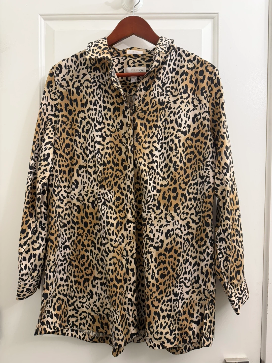 Chico's leopard print shirt. It's a classic button-up style with a collared neck. Looks great for dressing up or down!