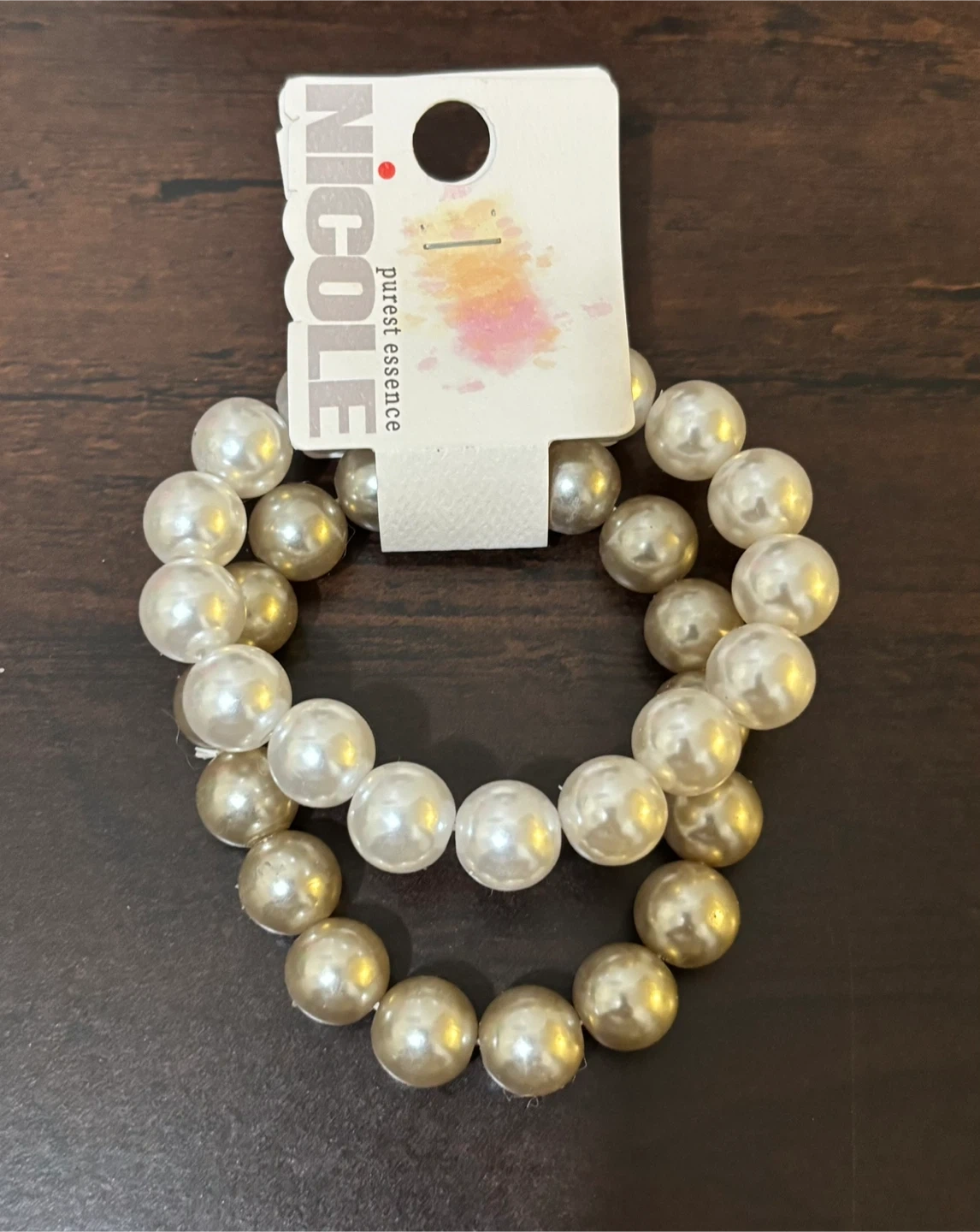 This set includes two faux pearl beaded bracelets from Nicole's "Purest Essence" line. The beads are a mix of creamy white and champagne gold colors. They're strung on elastic for an easy fit.