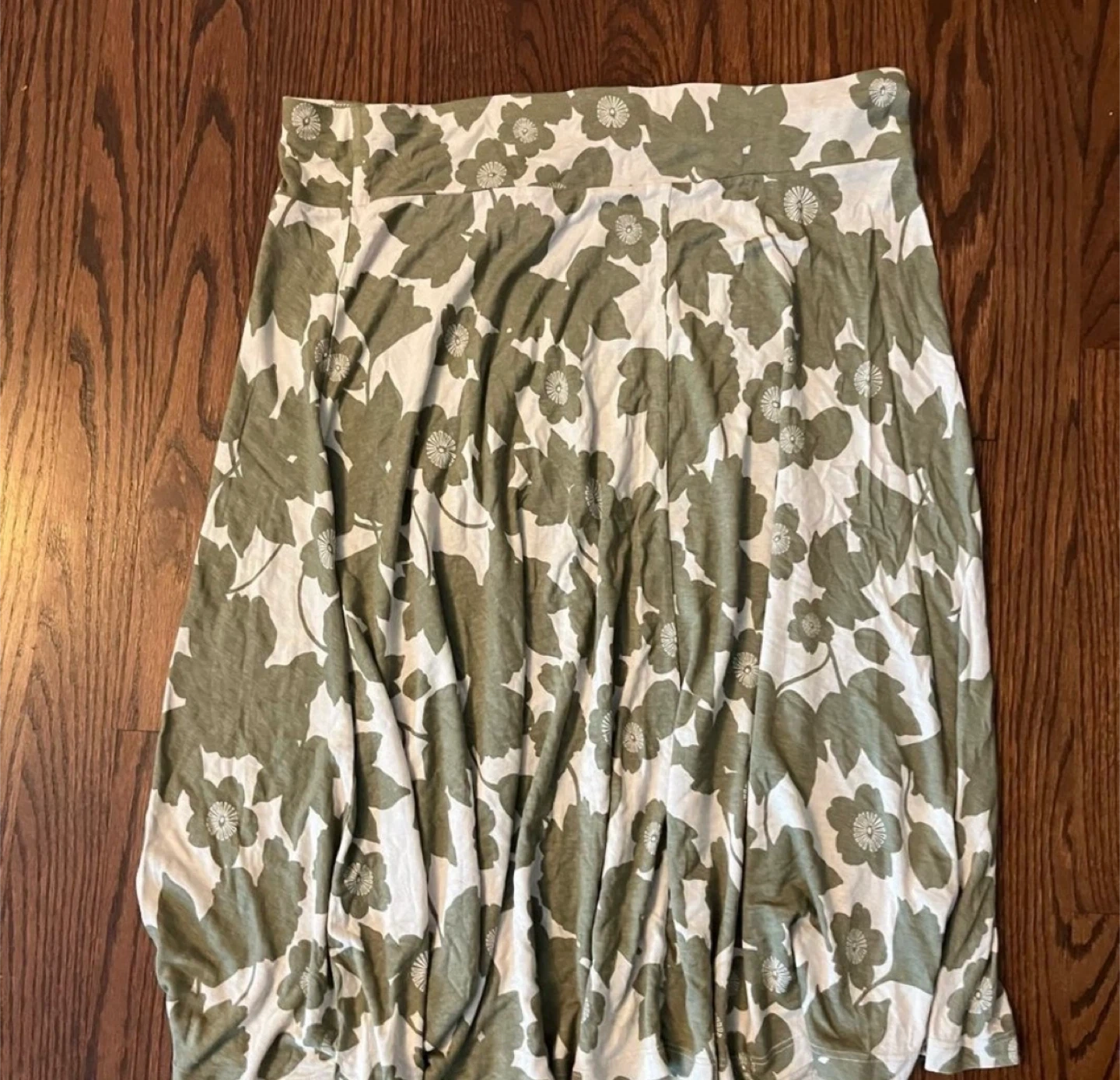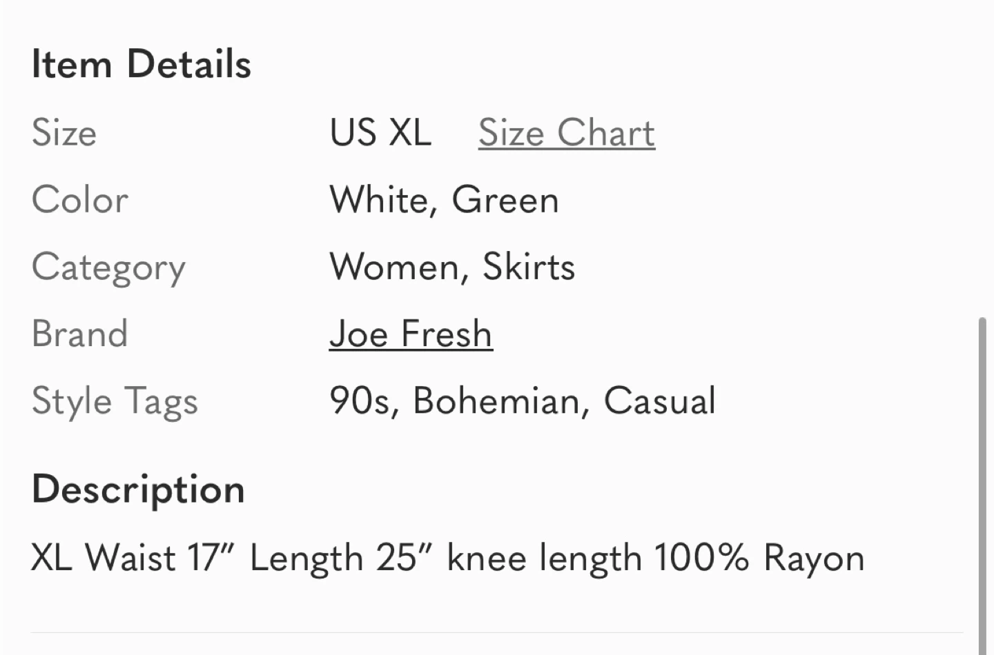This is a Joe Fresh skirt in size XL! It features a white and green floral pattern and is made of 100% rayon. The waist measures 17" and the length is 25". It's a knee-length skirt with a casual, bohemian style!