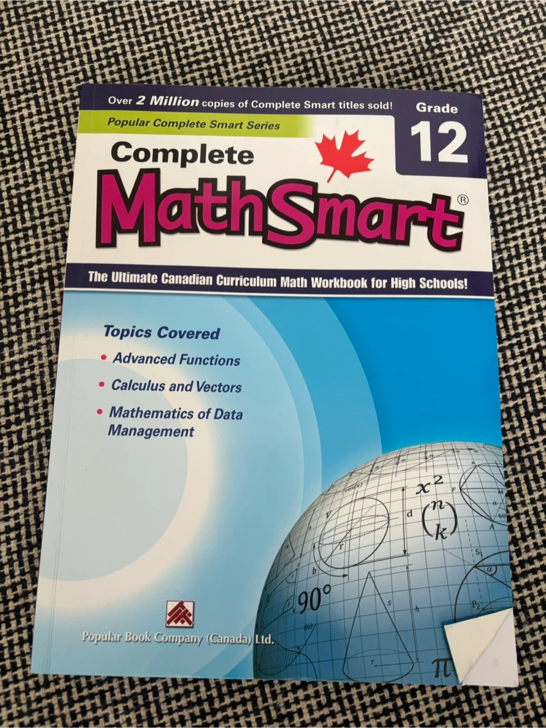 This is the Complete Math Smart Grade 12 workbook, covering the ultimate Canadian curriculum for high schools. It includes topics like Advanced Functions, Calculus and Vectors, and Mathematics of Data Management. This workbook is useful for Grade 12 students needing to review or prepare for their math courses.