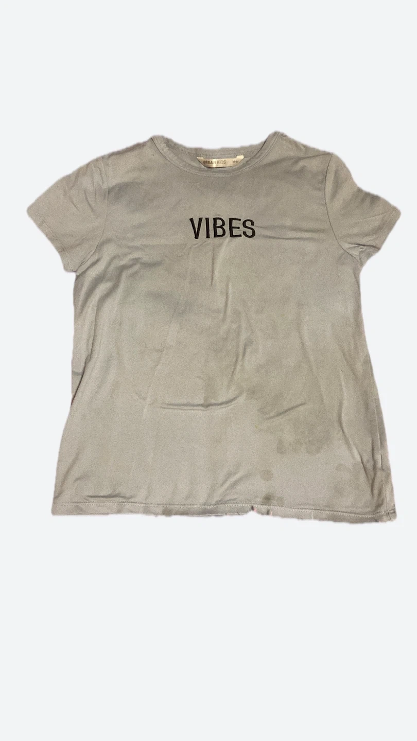 This is a gray URBAN KIDS t-shirt with 'VIBES' printed on the front. It's a size M/M. There are some visible stains on the front of the shirt but that easily comes off.