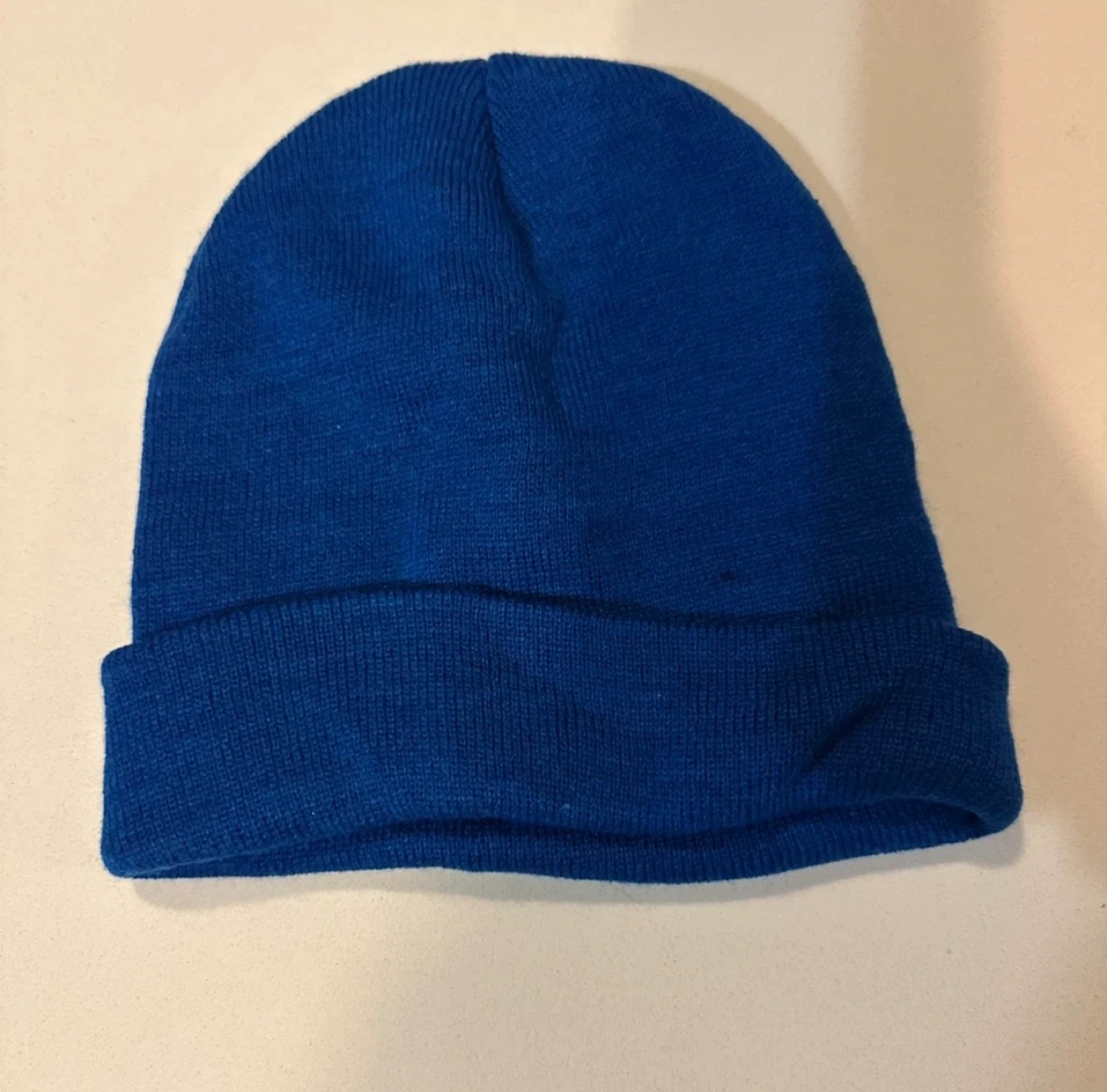 This is a royal blue, one-size-fits-most knit beanie. It's made of a soft acrylic material for warmth. Perfect for keeping your head cozy during cooler weather!