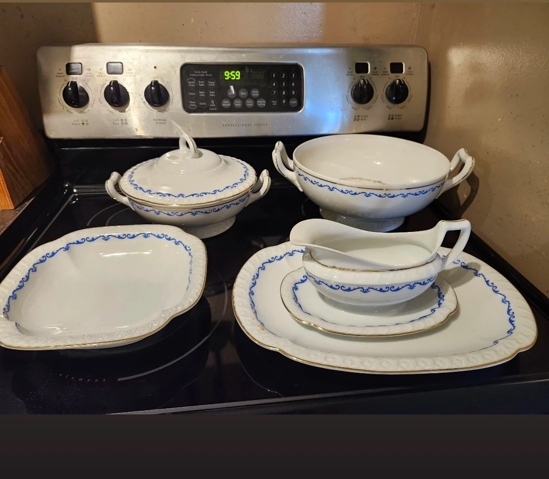 A set of white porcelain serving dishes with a blue ornate pattern and gold trim. Includes a lidded tureen, a large serving bowl, a platter with a gravy boat and underplate, and a smaller serving dish. These pieces are suitable for special occasions or everyday use. Complete service for 12 no chips/scratches