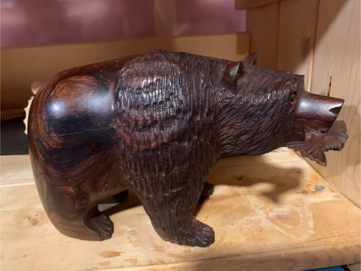 A beautiful carved wooden bear figurine, perfect for adding a touch of rustic charm to your home decor. The bear has a lovely dark wood finish with intricate detailing. It's in great condition and ready to find a new home!