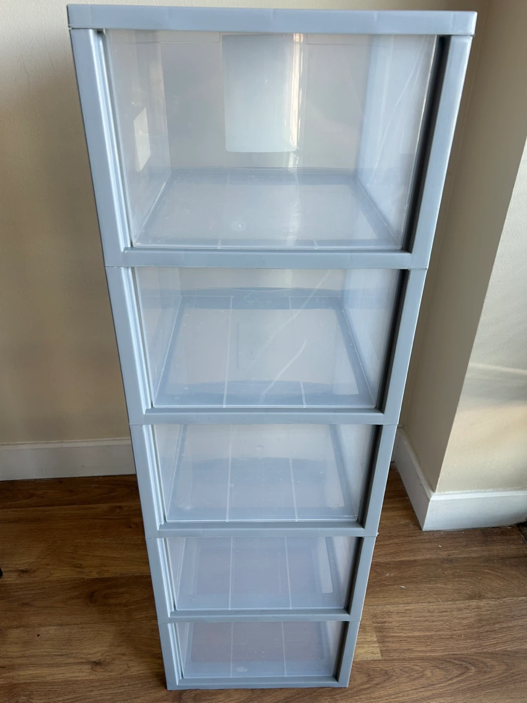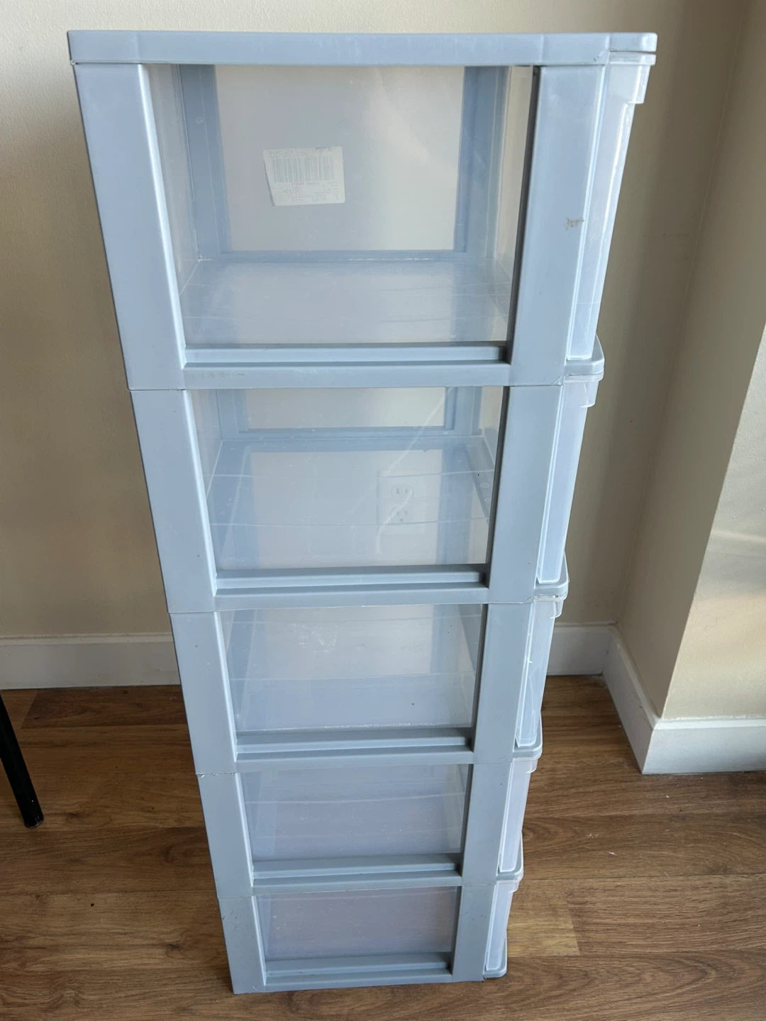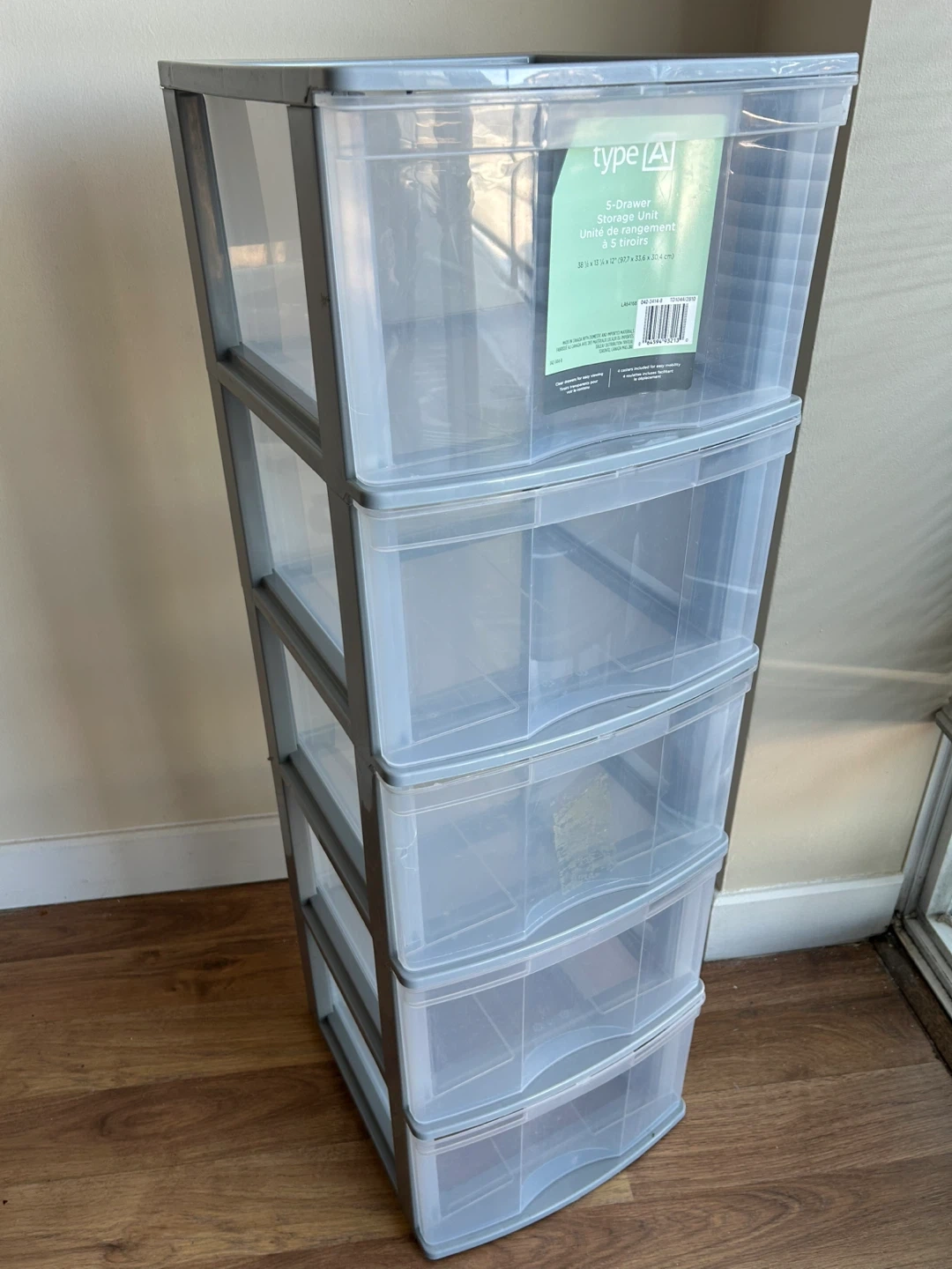 This is a Type A 5-drawer storage unit. It's clear plastic with a grey frame. Dimensions are 3 inches wide.