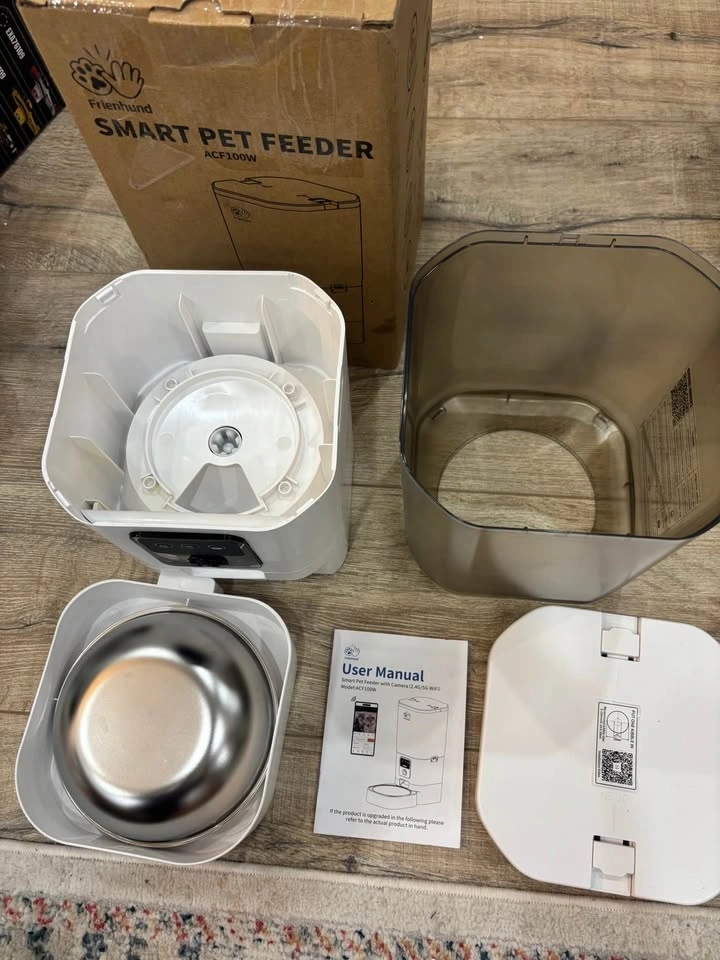 Selling a brand new, never used Frienhund Automatic Pet Feeder (Model ACF100W). This is a high-end model that offers full control over your pet's feeding schedule from your phone. It has a 2K High-Definition Camera with Night Vision, 5G & 2.4G Dual-Band WiFi, and a large 7L capacity (holds up to 29 cups of dry food), perfect for cats or small-to-medium dogs. You can easily set portion sizes and feeding times via the app. The feeder features a detachable design with a stainless steel bowl for easy cleaning and has a dual power supply (wall outlet or batteries). Everything works perfectly. You're welcome to test it here before buying. This unit retails for much more elsewhere. My price is $35 firm.