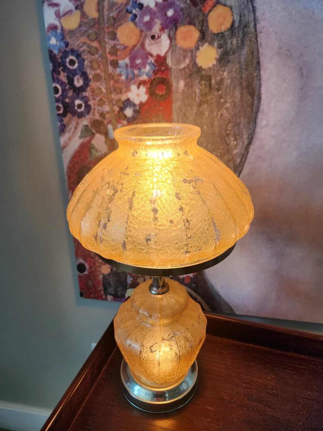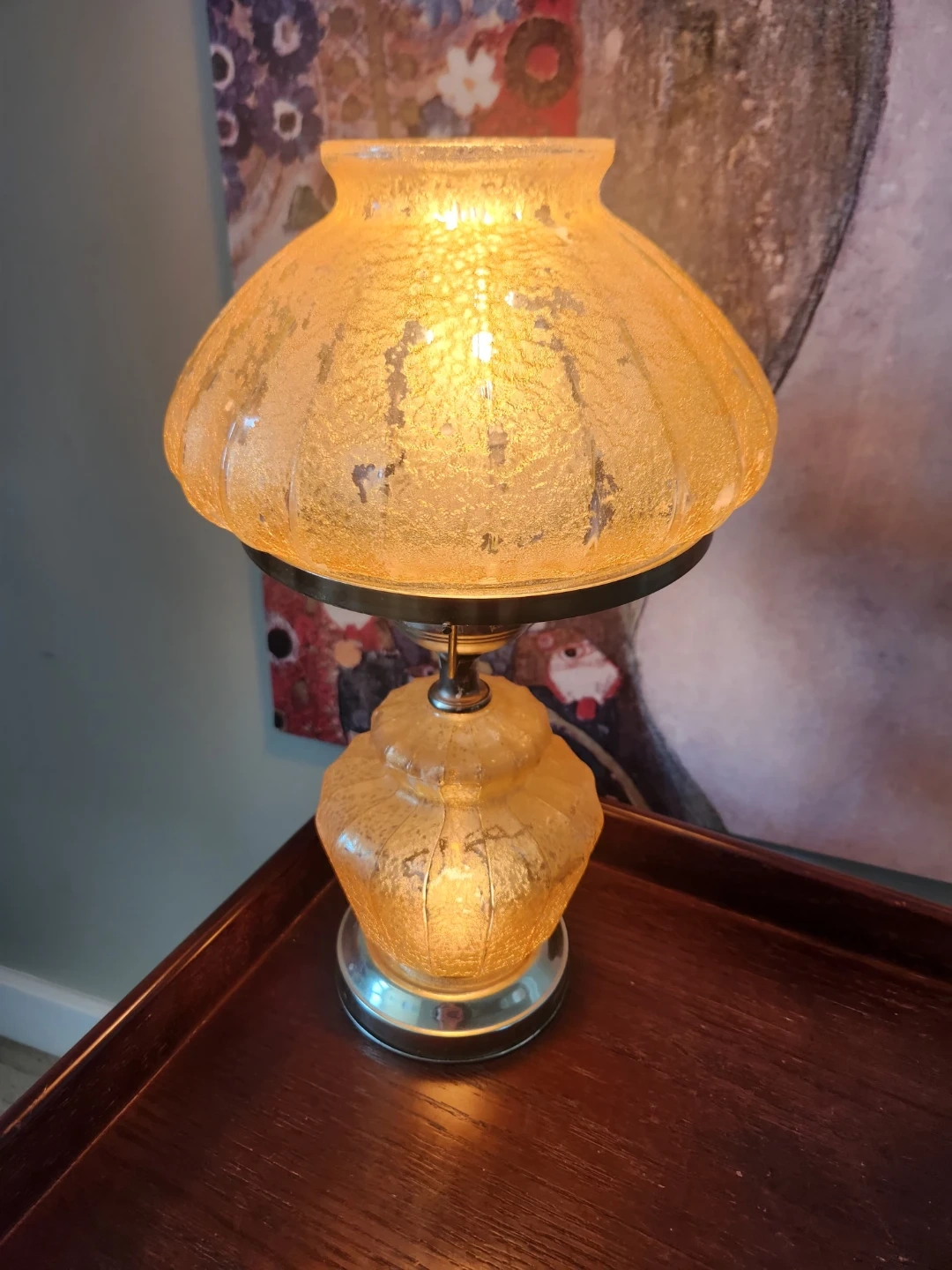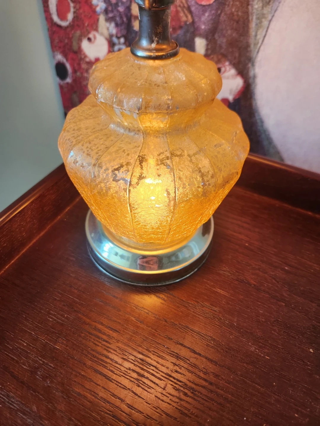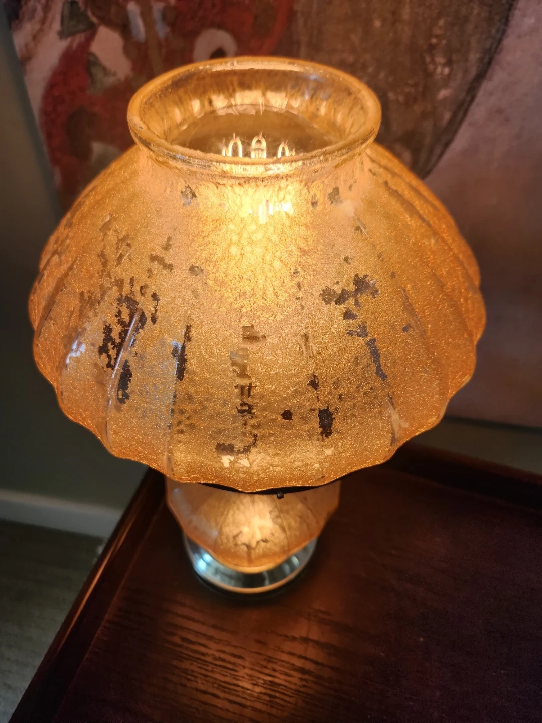 This amber glass lamp offers 3 settings. Provides a warm glow and moody illumination Textured glass shade and a base are Perfect for adding a cozy accent to any room! 15 inches high and 9 inches diameter, and its small space friendly.