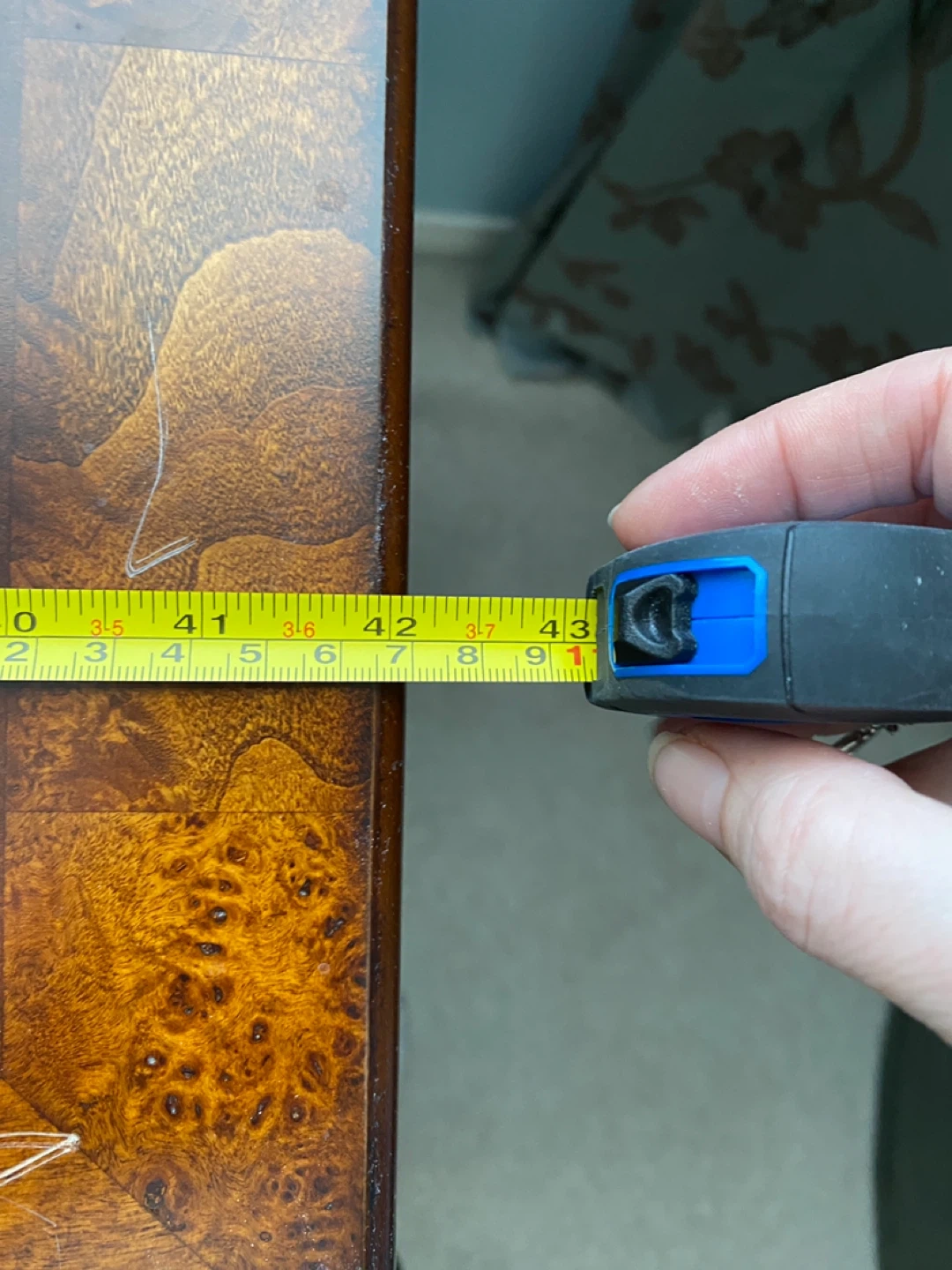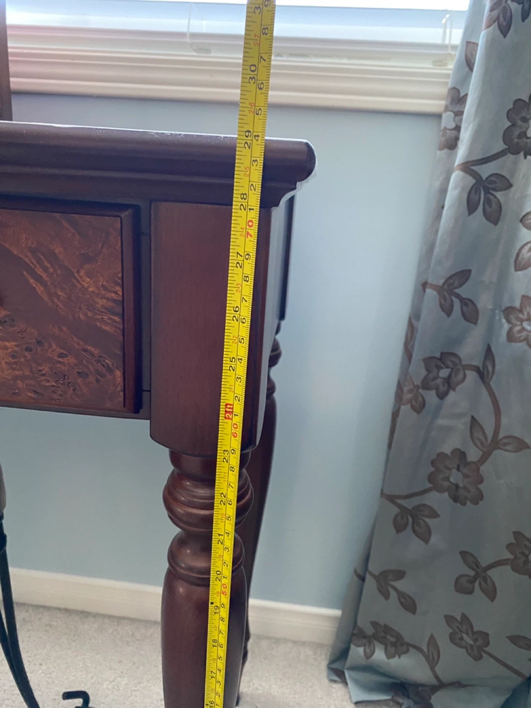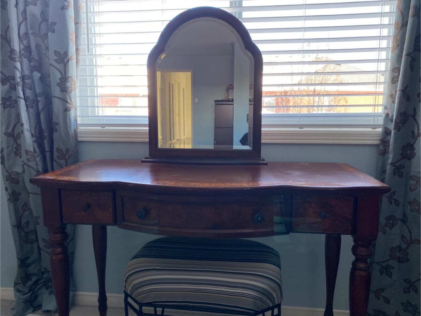 A classic vanity table set featuring a wooden top and three drawers. It comes with a matching mirror and upholstered stool. Wood material with a burl veneer inlay. Some minor scratches and marks on the surface.