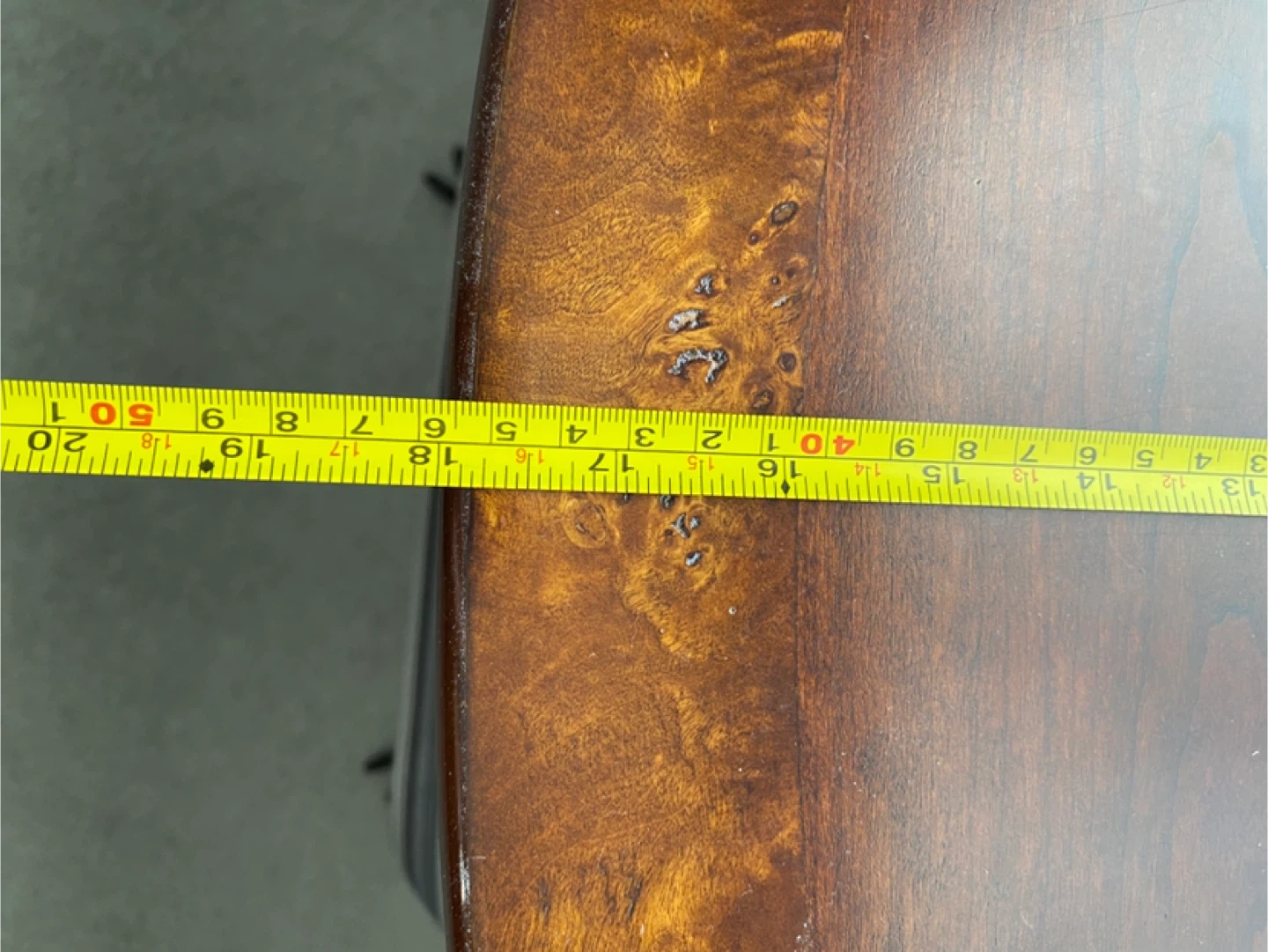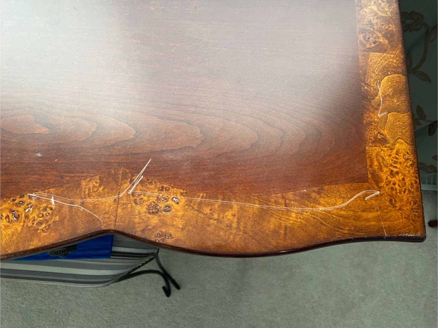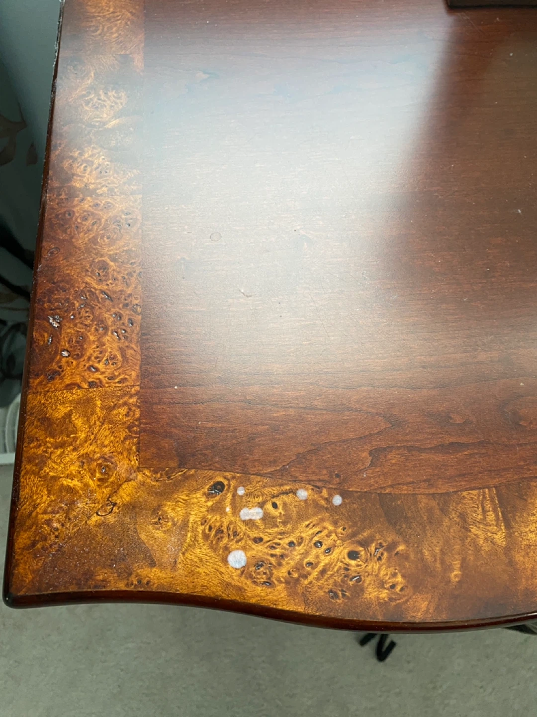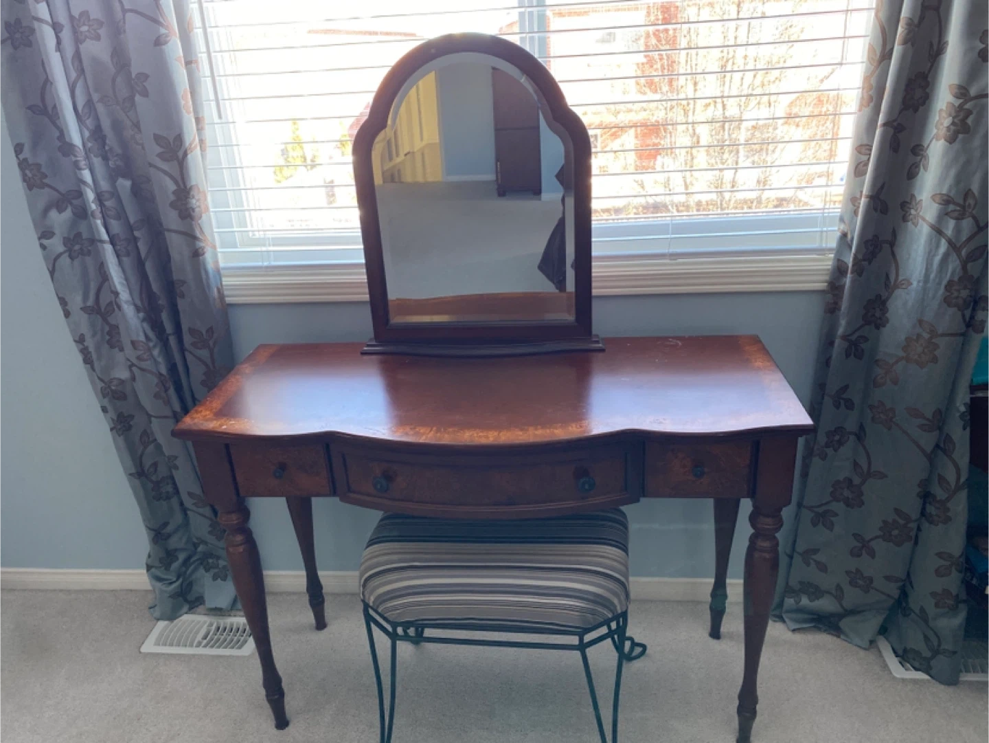 A classic vanity table set featuring a wooden top and three drawers. It comes with a matching mirror and upholstered stool. Wood material with a burl veneer inlay. Some minor scratches and marks on the surface.