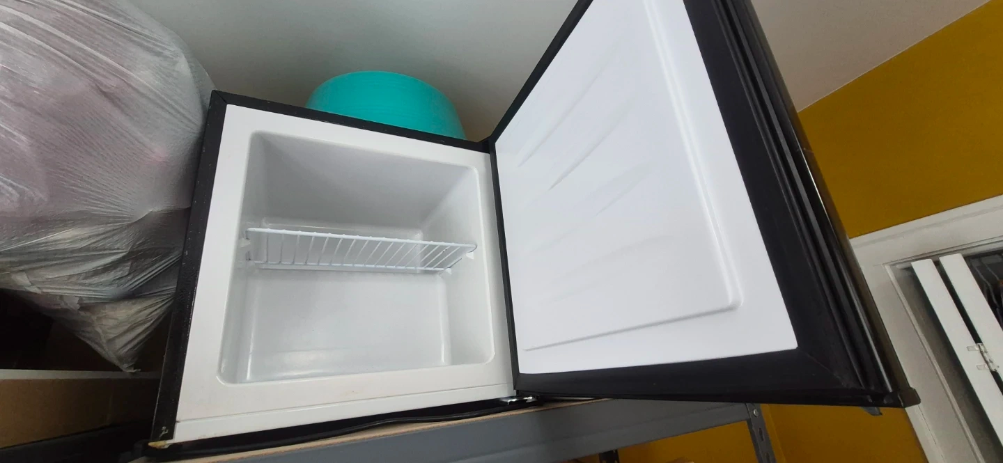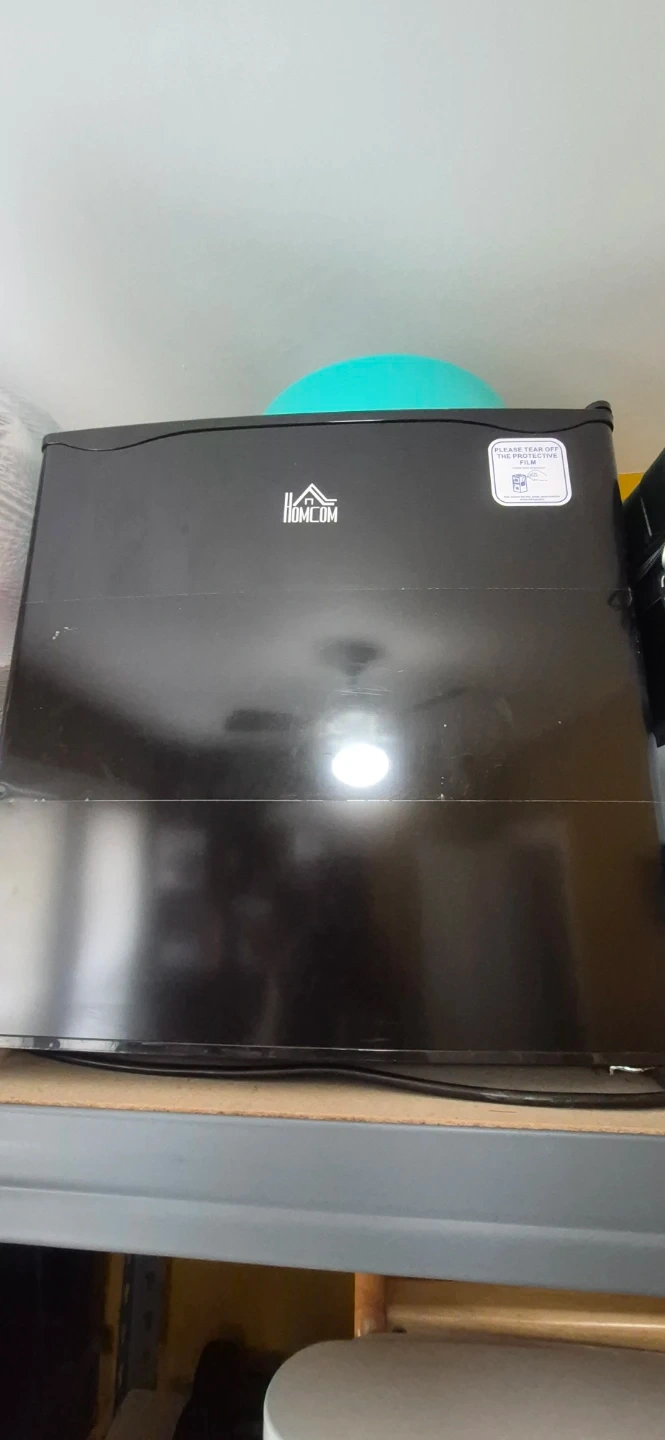 This is a black HOMCOM mini fridge. It's compact and ideal for small spaces. Comes with one interior shelf. Perfect for keeping drinks or snacks cool!