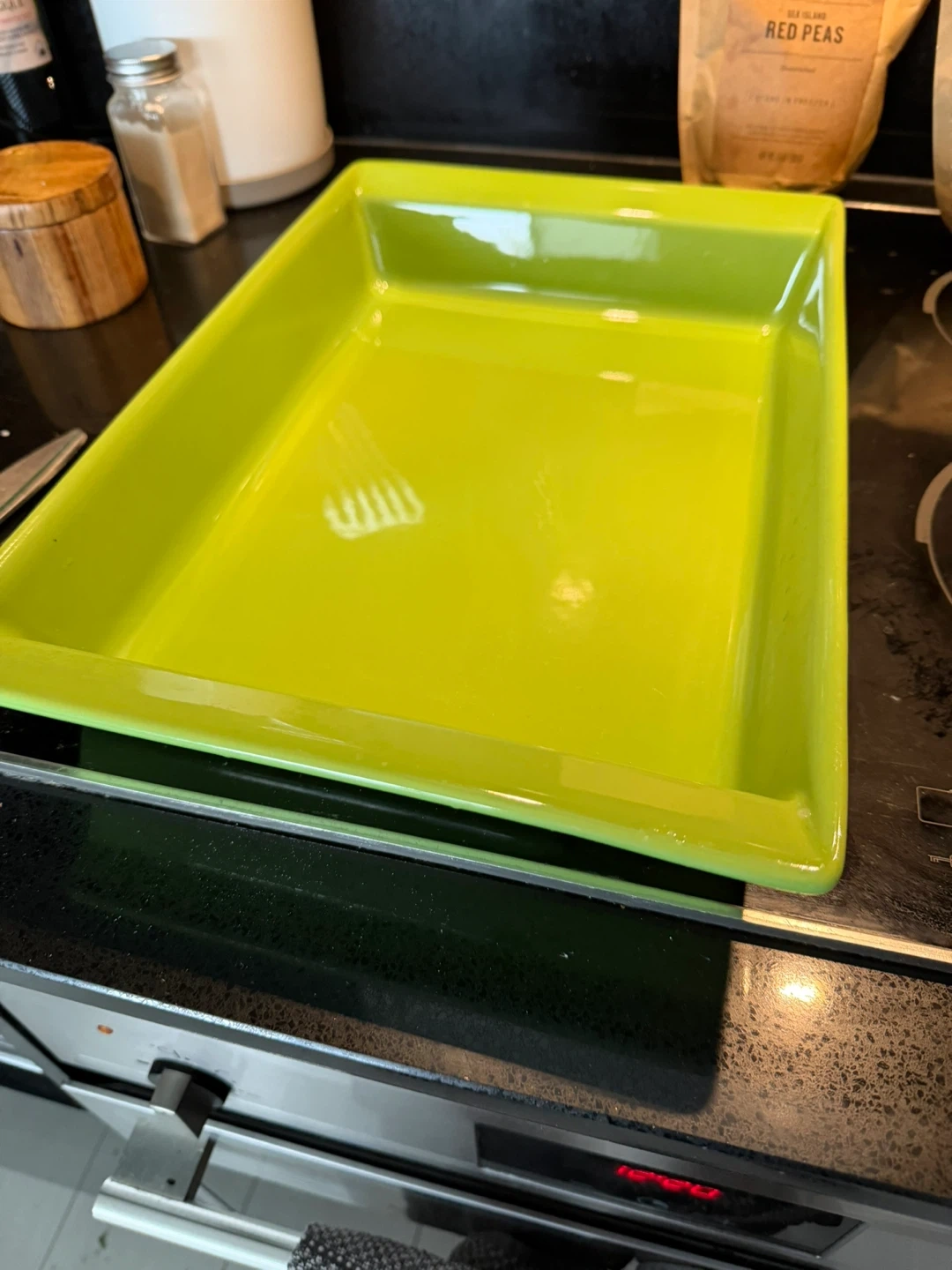A bright lime green ceramic baking dish. It's perfect for roasting vegetables or baking pies or lasagne. Made in France. Very light usage.