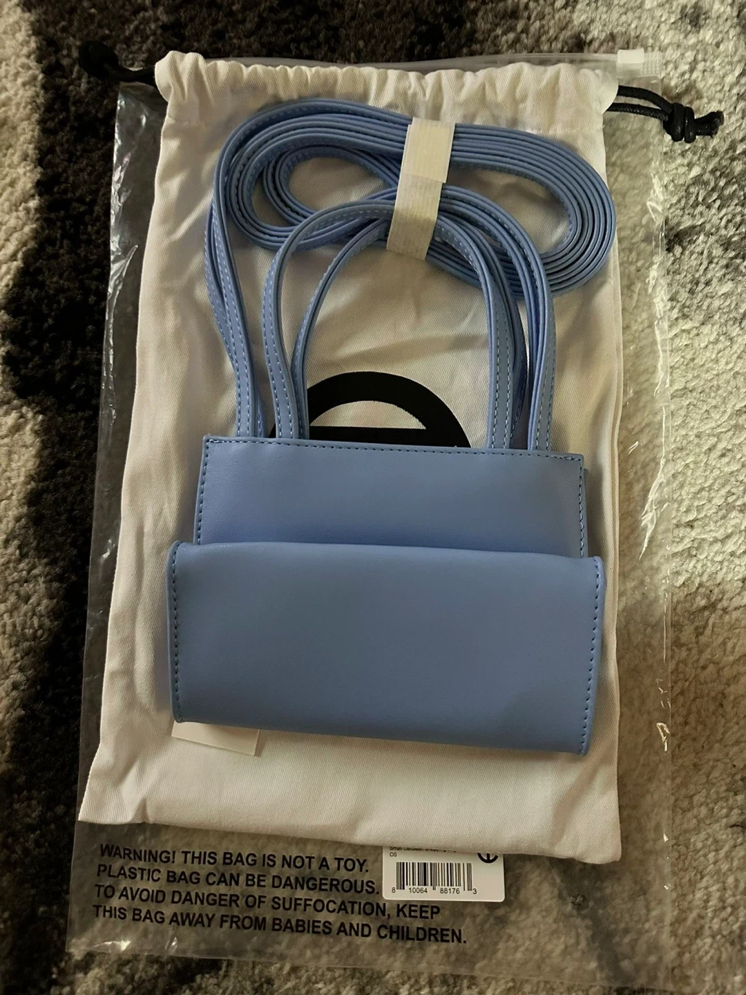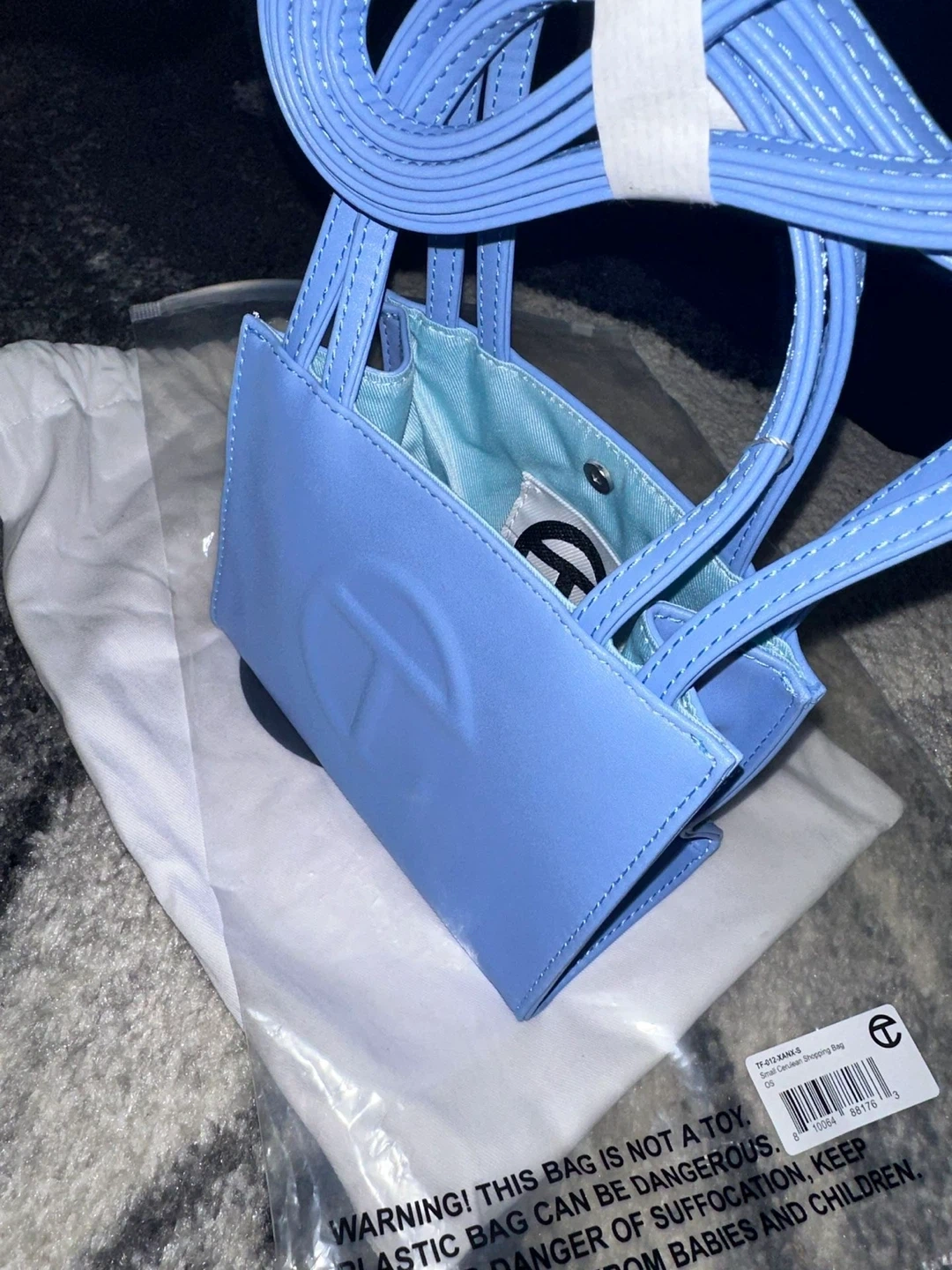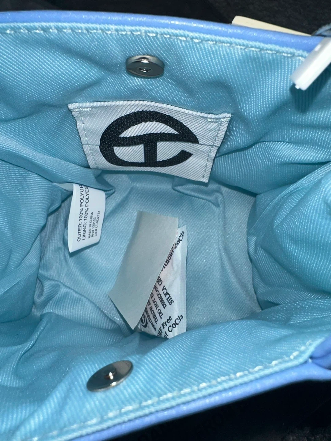 Small Telfar shopping bag in baby blue. Includes dust bag and strap. Outer is 100% polyurethane, lining is 100% polyester.
