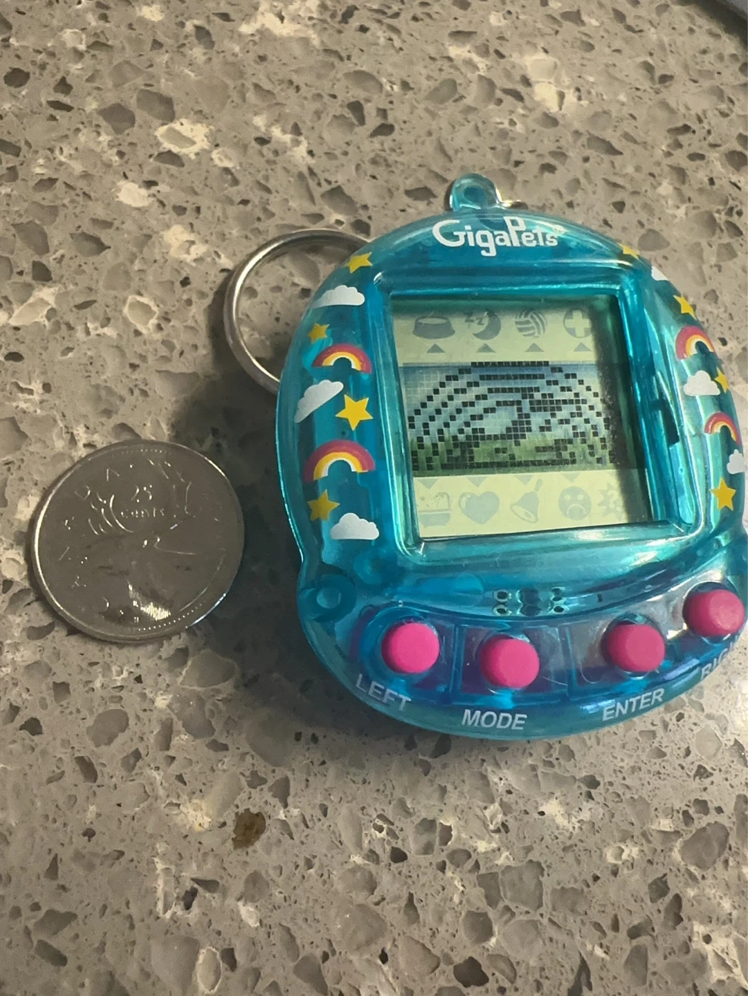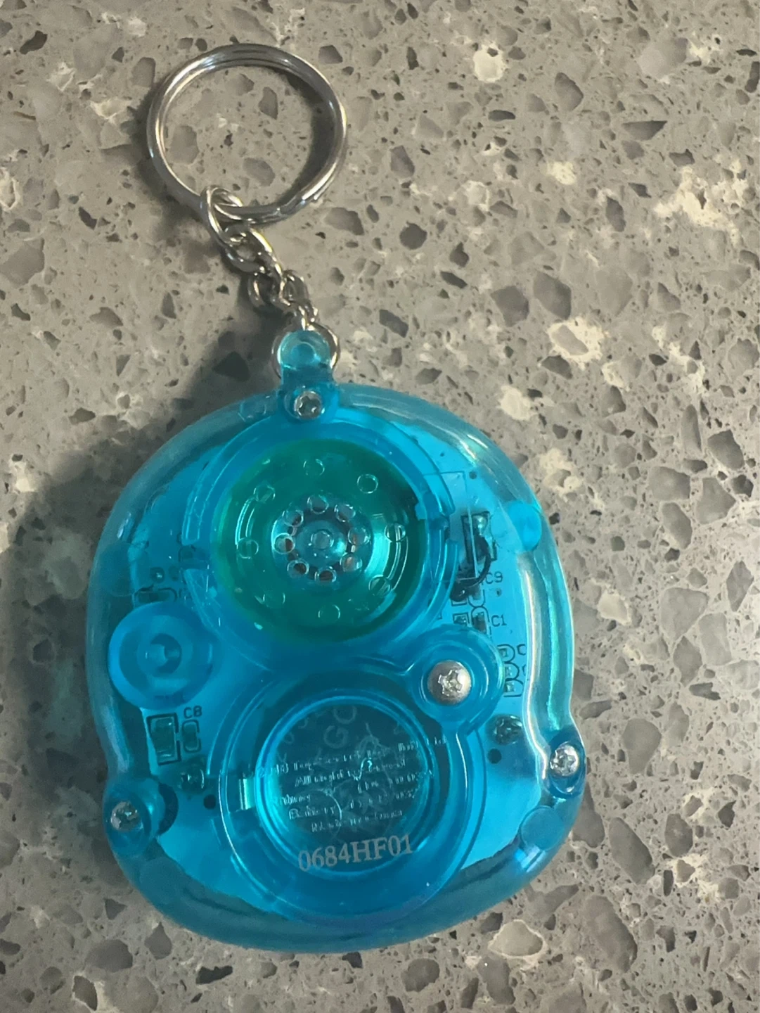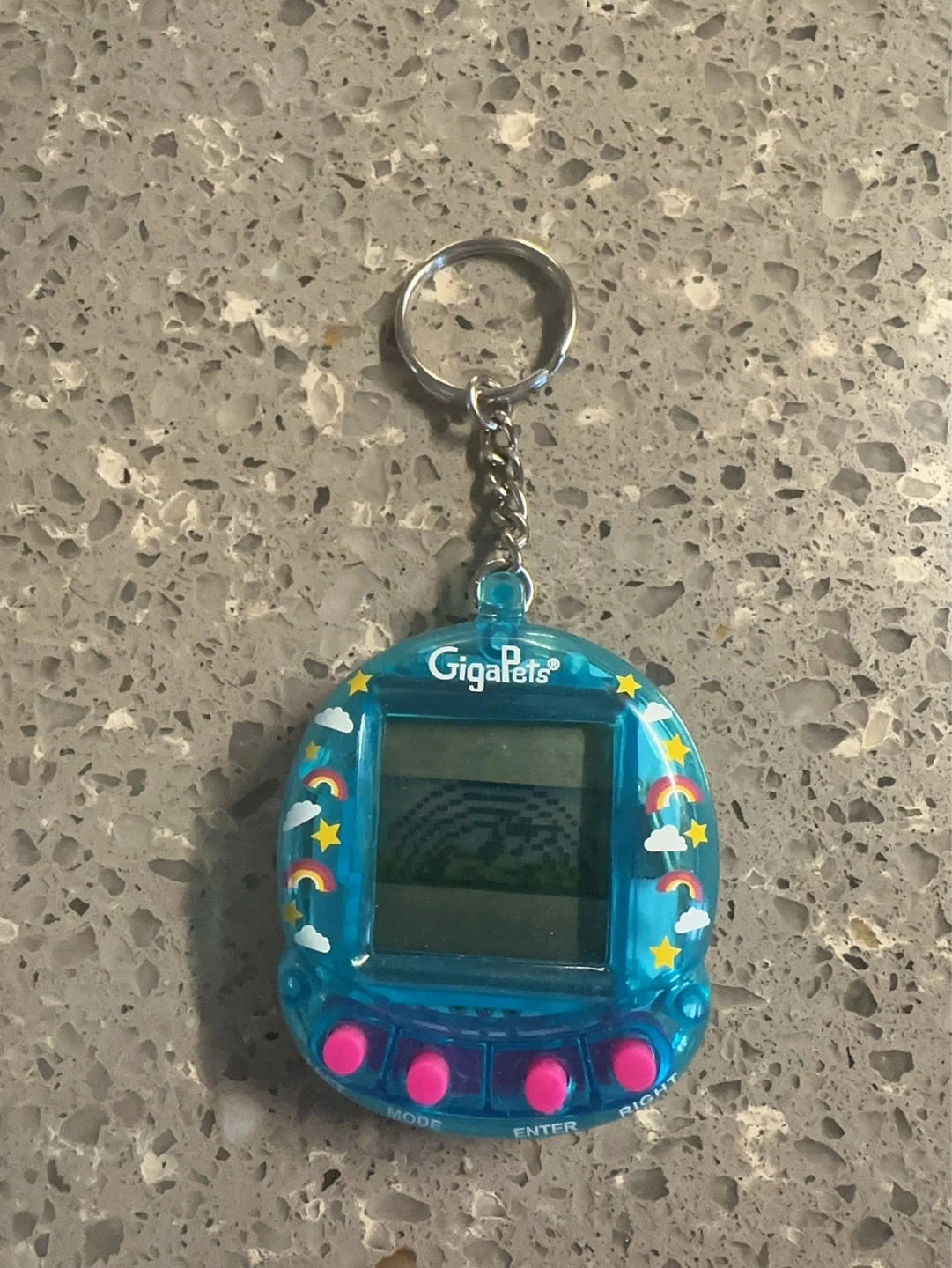 It's a blue GigaPets virtual pet keychain. This electronic toy features a pixelated screen and colourful buttons. Includes a metal keychain ring for easy carrying.