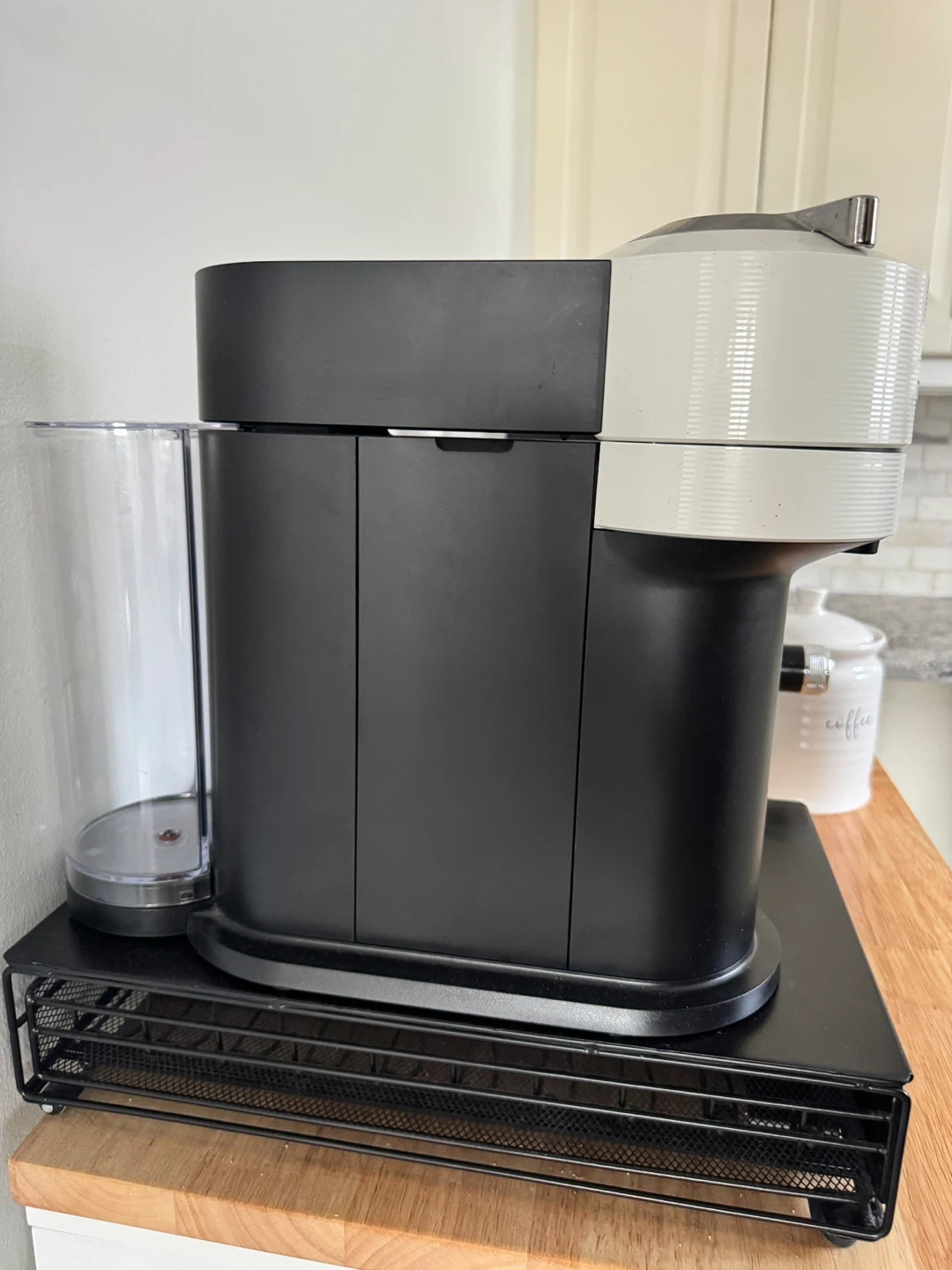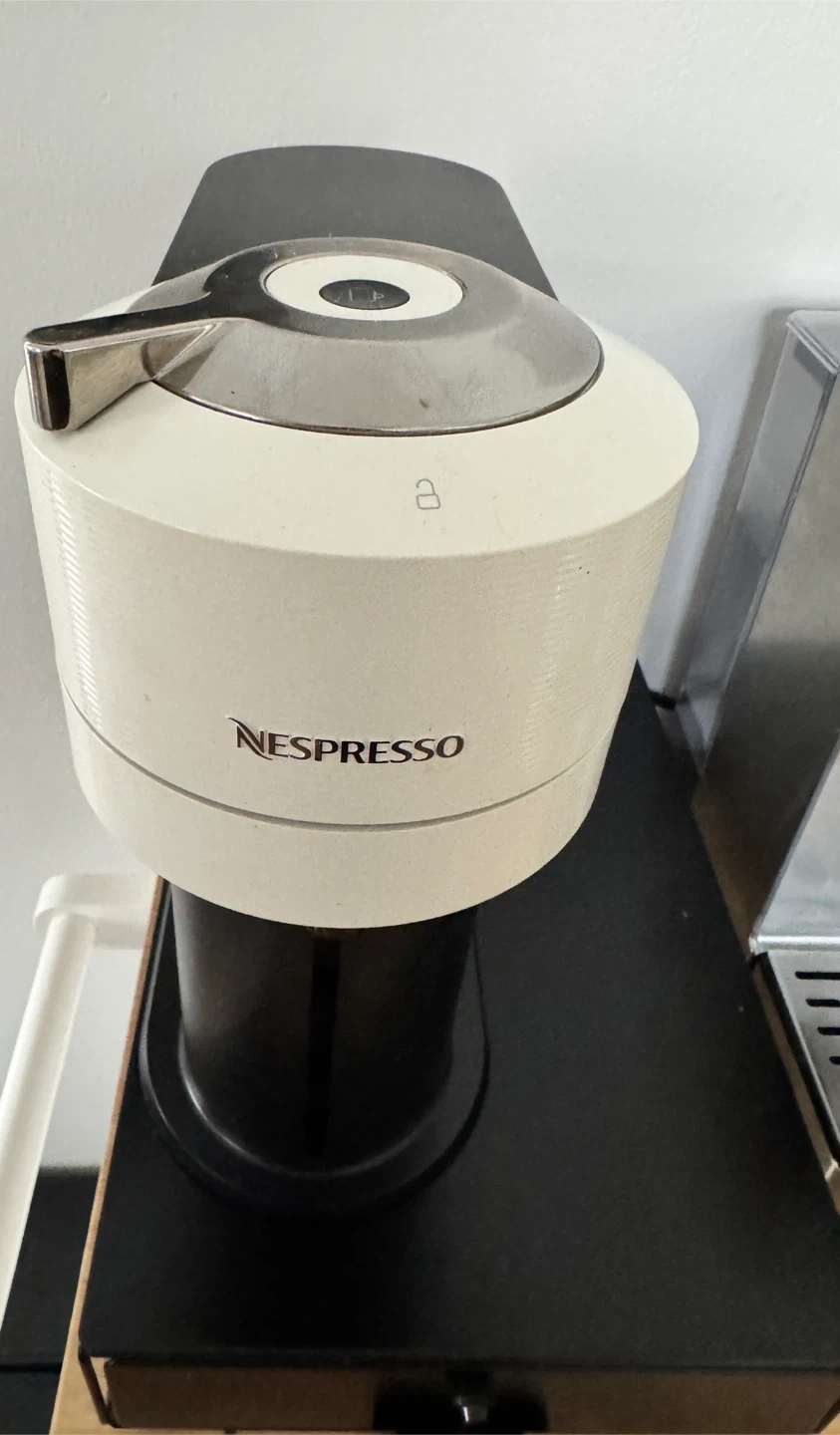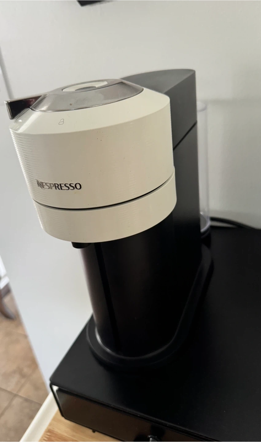 Nespresso Vertuo coffee machine in black and white Makes espresso and coffee. Includes water reservoir and drip tray. I’ll throw in the pod holder for $10 if interested.