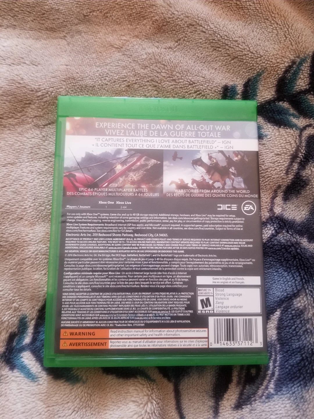 Xbox One video game, Battlefield 1. Experience the dawn of all-out war and relive the greatest battles of WWI. It's an epic multiplayer shooter with massive battles and large-scale combat. Asking $10 Please let me know if Interested!
