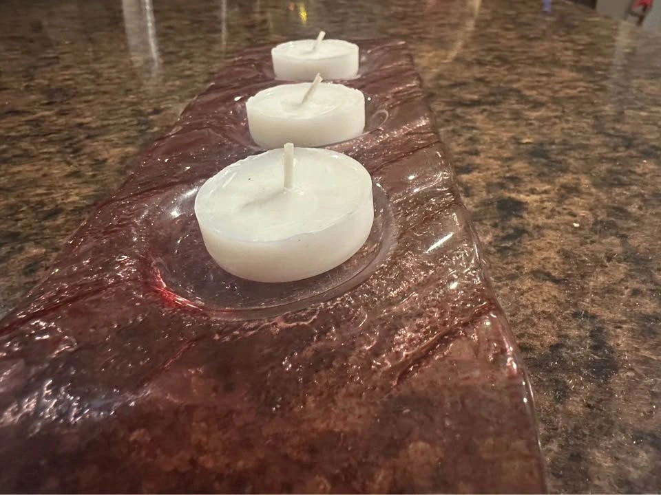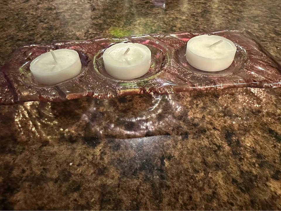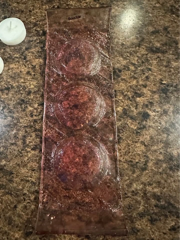Bouclair glass candle holder designed with three circular indentations.