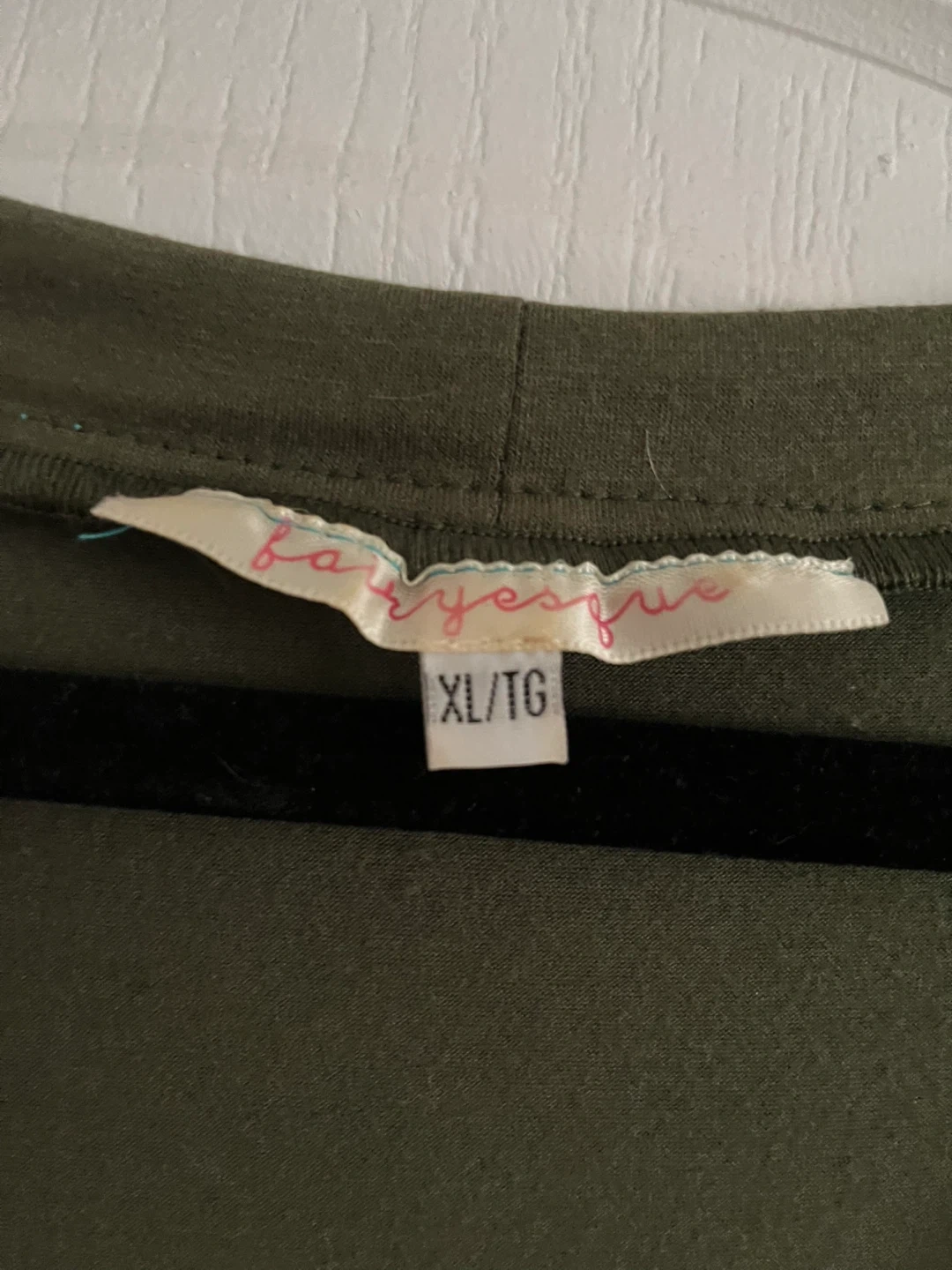 Olive green short-sleeved top from Bellydance Oasis. Features lime green ribbon detailing with a ruffled texture across the front. Size XL/TG.