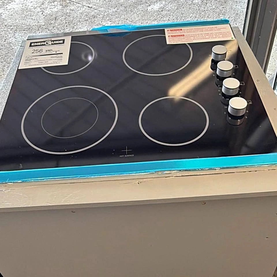 This is an electric stove and oven with a black glass cooktop featuring four burners and a stainless steel exterior. The oven also has a stainless steel exterior and a digital display. The unit is packaged with blue tape and includes EnerGuide labels. It comes with a 1-year warranty.