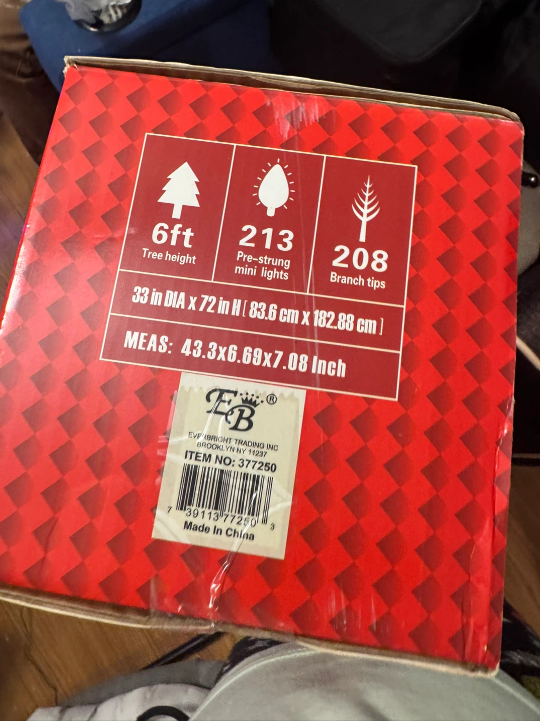 Selling a brand new Everbright 6ft LED Christmas Tree still in its original packaging! It features 213 pre-strung mini lights and 208 branch tips. The tree's dimensions are 33 inches in diameter and 72 inches in height (83.6 cm x 182.88 cm). The box measures 43.3 x 6.69 x 7.08 inches