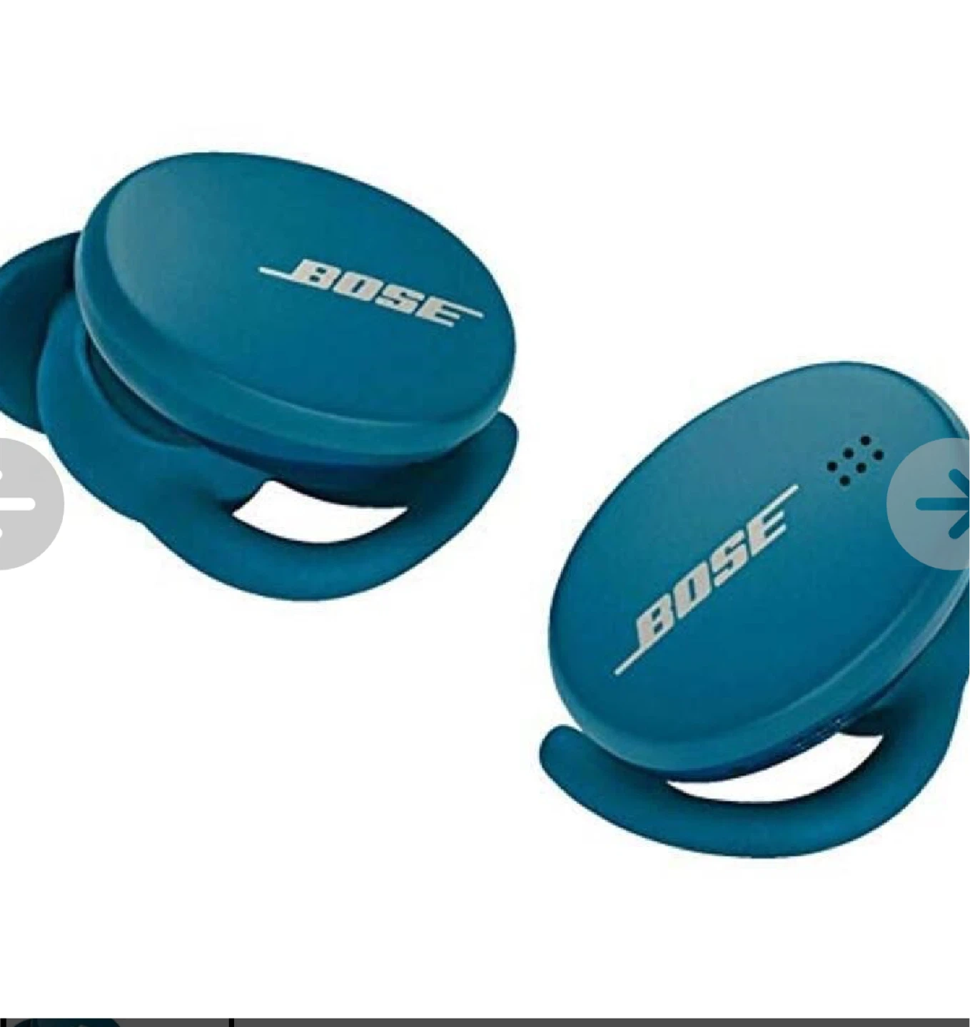 Blue Bose Sport wireless earbuds. These are designed for workouts and offer a secure and comfortable fit. They're sweat and weather resistant.