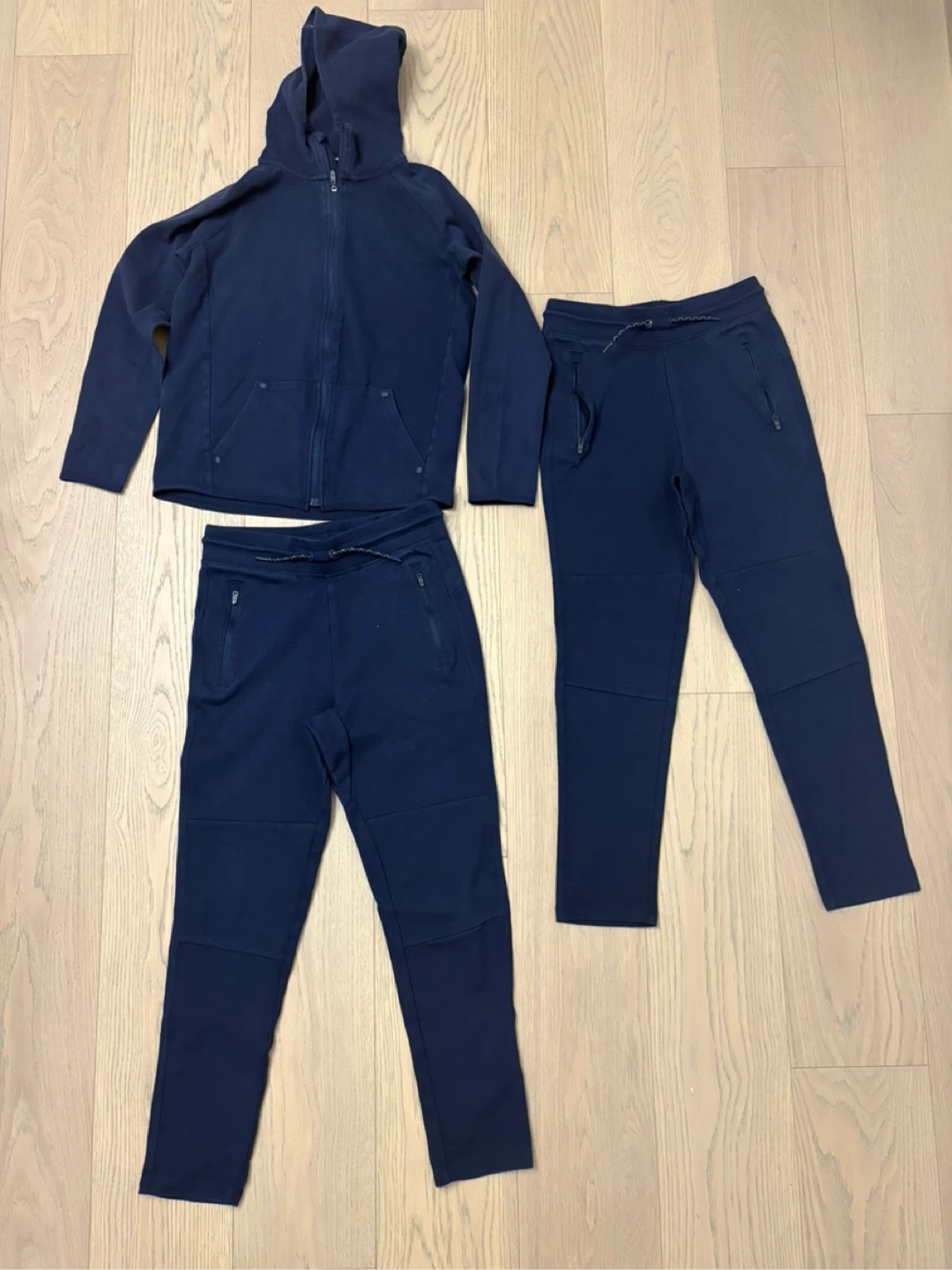 This GapFit tracksuit set includes a zip-up hoodie and two pairs of sweatpants in navy blue. The hoodie has a full zip closure and front pockets. Sweatpants feature an elastic waistband with a drawstring and zippered pockets.