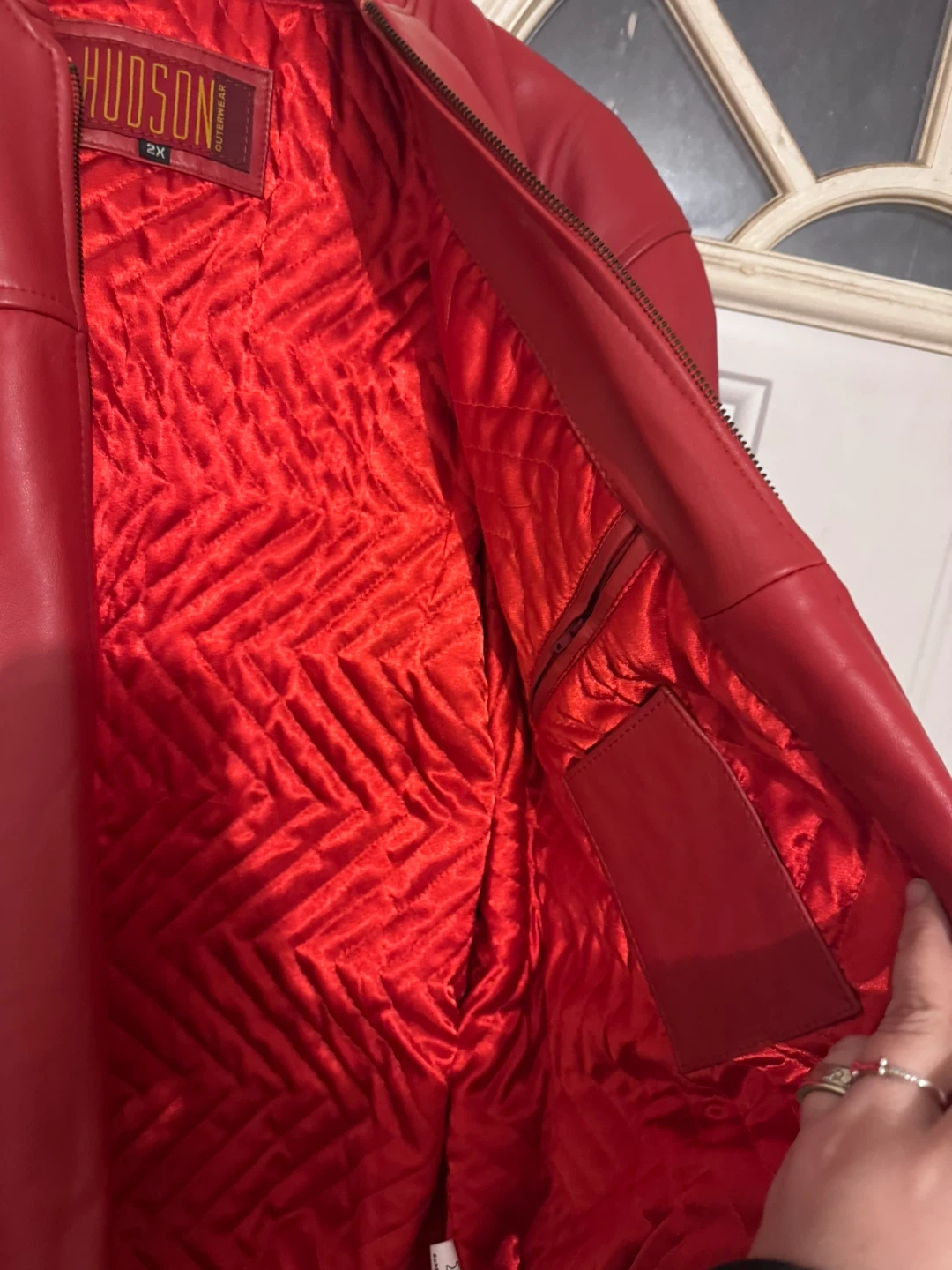 Here's a stylish red leather bomber jacket from Hudson Outerwear. It's a size 2X and has a cool, quilted red lining. It's in great condition and ready for a new owner!