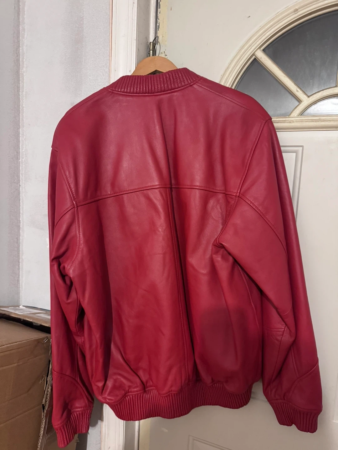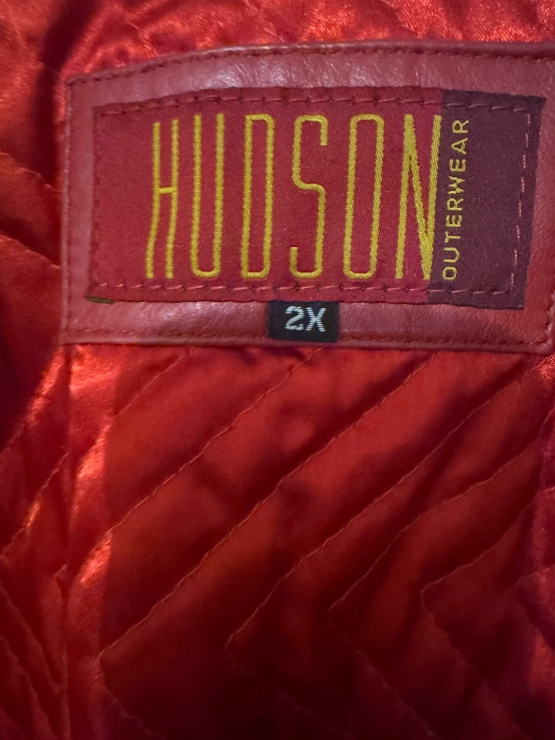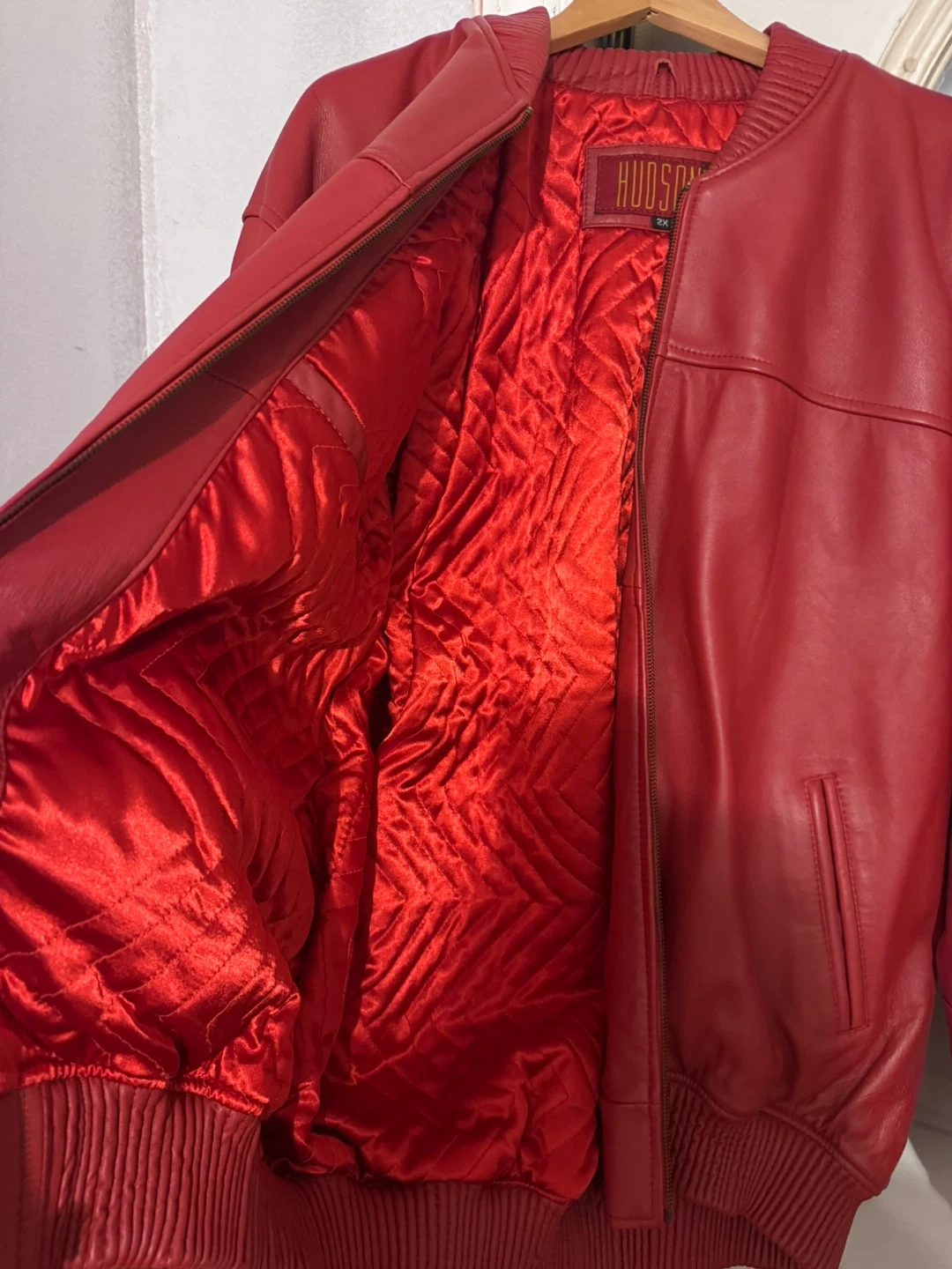 Here's a stylish red leather bomber jacket from Hudson Outerwear. It's a size 2X and has a cool, quilted red lining. It's in great condition and ready for a new owner!