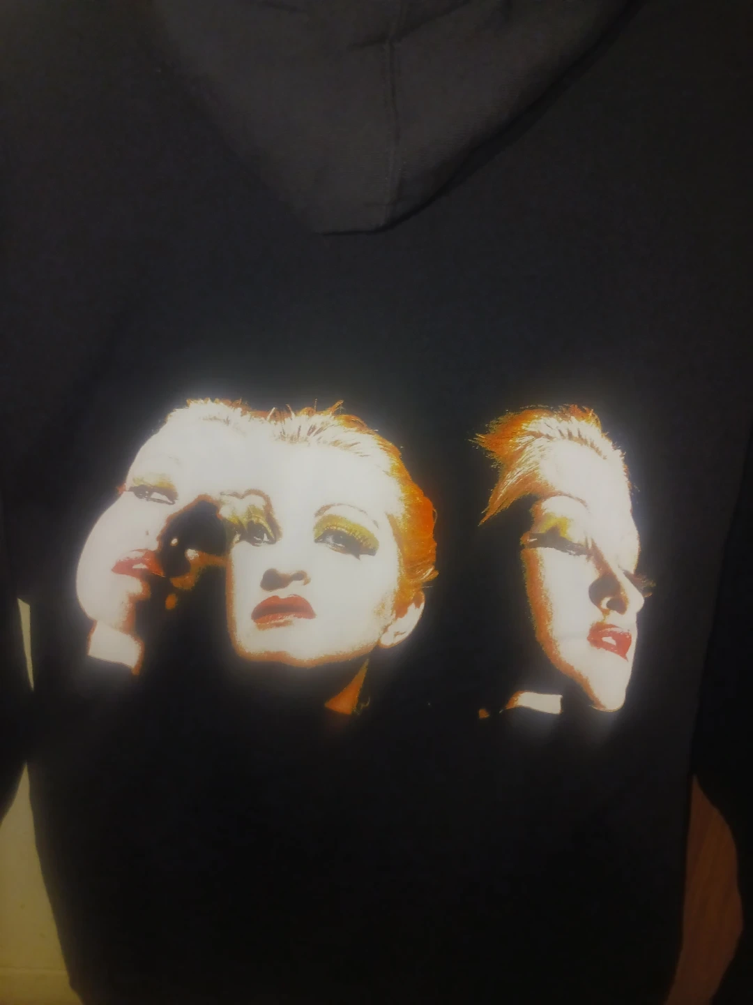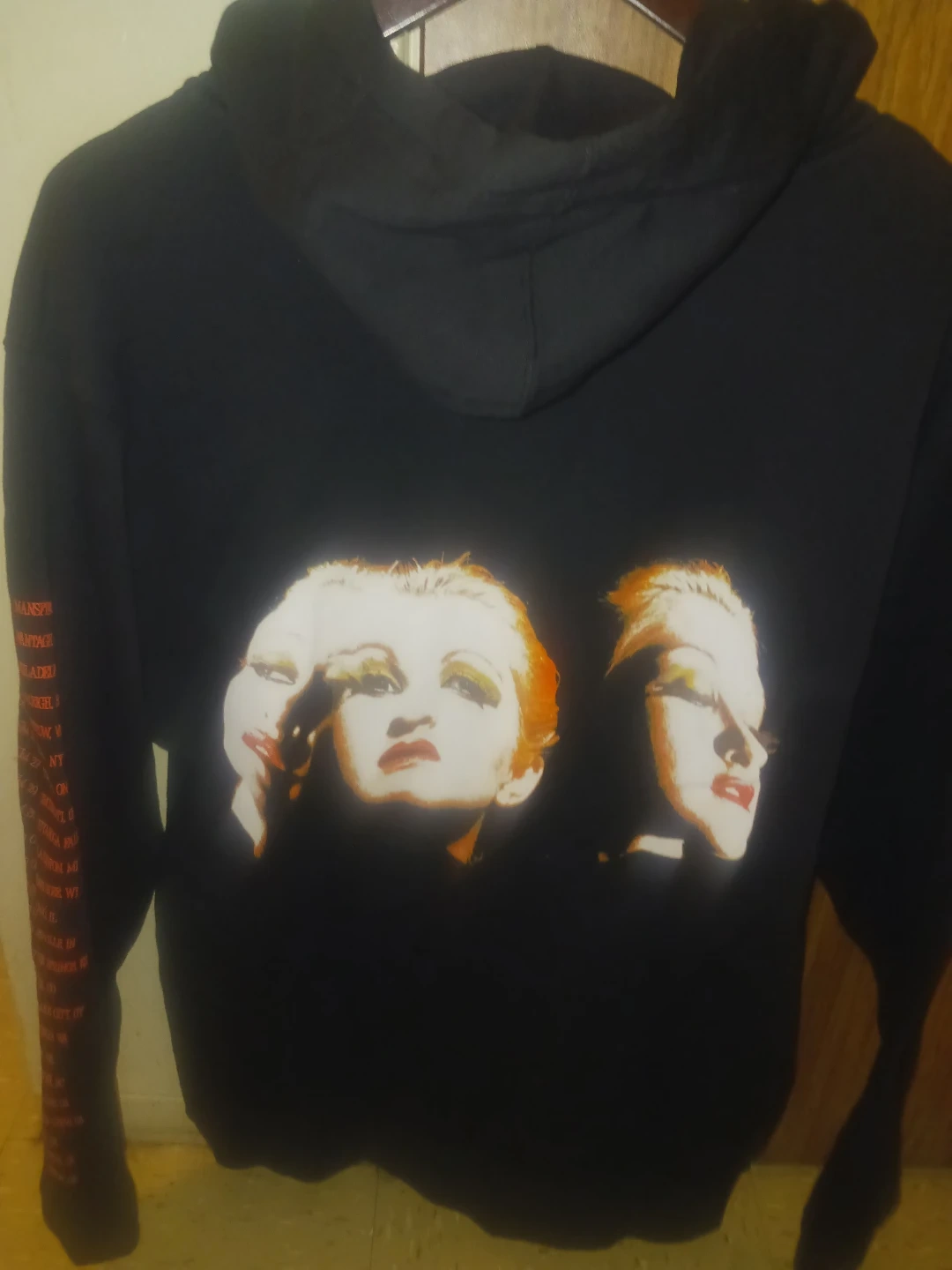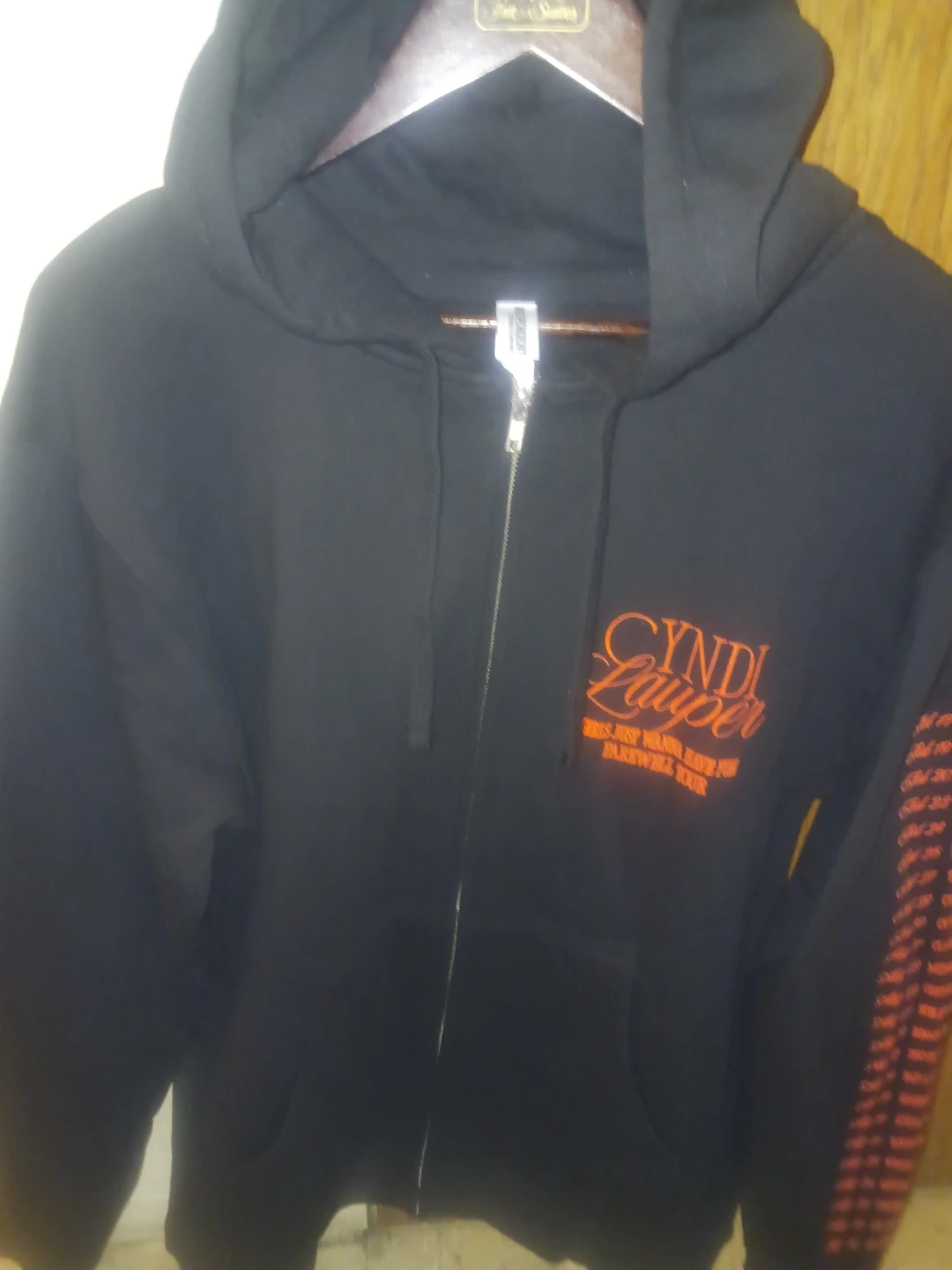 Black zip-up hoodie commemorating Cyndi Lauper's 'Girls Just Wanna Have Fun Farewell Tour'. Features "Cyndi Lauper" logo and tour name on the front. Back graphic shows stylized portraits of Cyndi Lauper. Sleeve has repeating tour text. Cotton blend material.