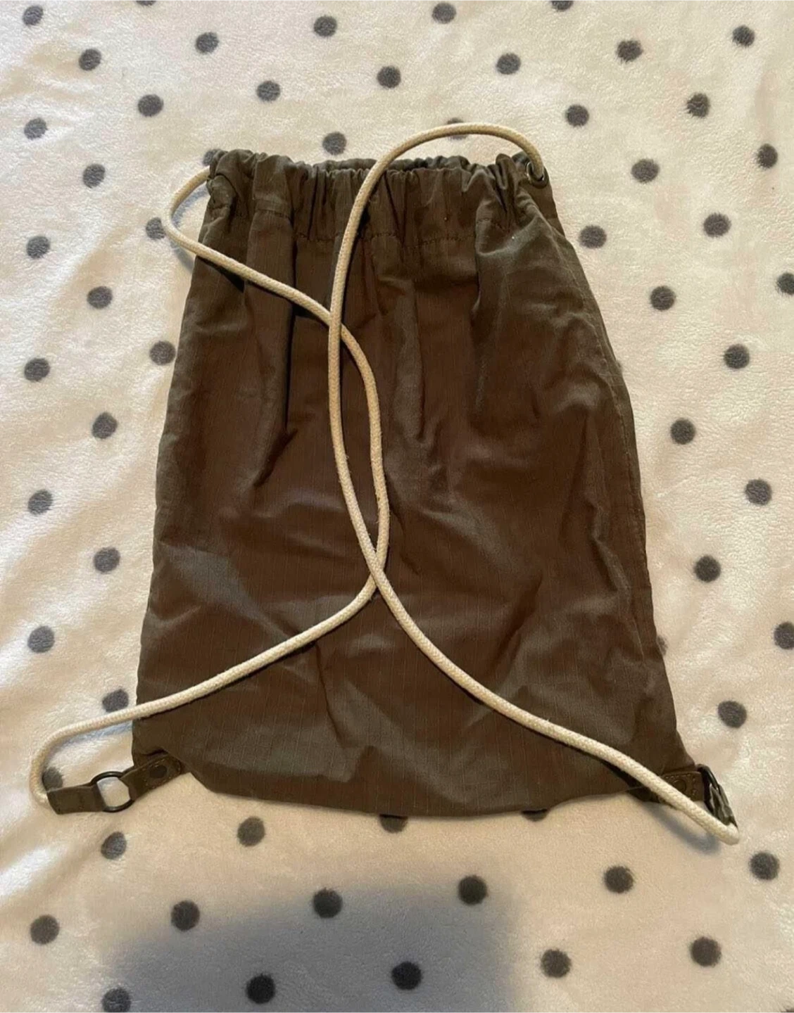 This is an Old Navy drawstring bag with an "Ace the Wave" graphic. It's made of a durable fabric and features adjustable rope straps for comfortable carrying. It's perfect for quick trips to the beach or gym!