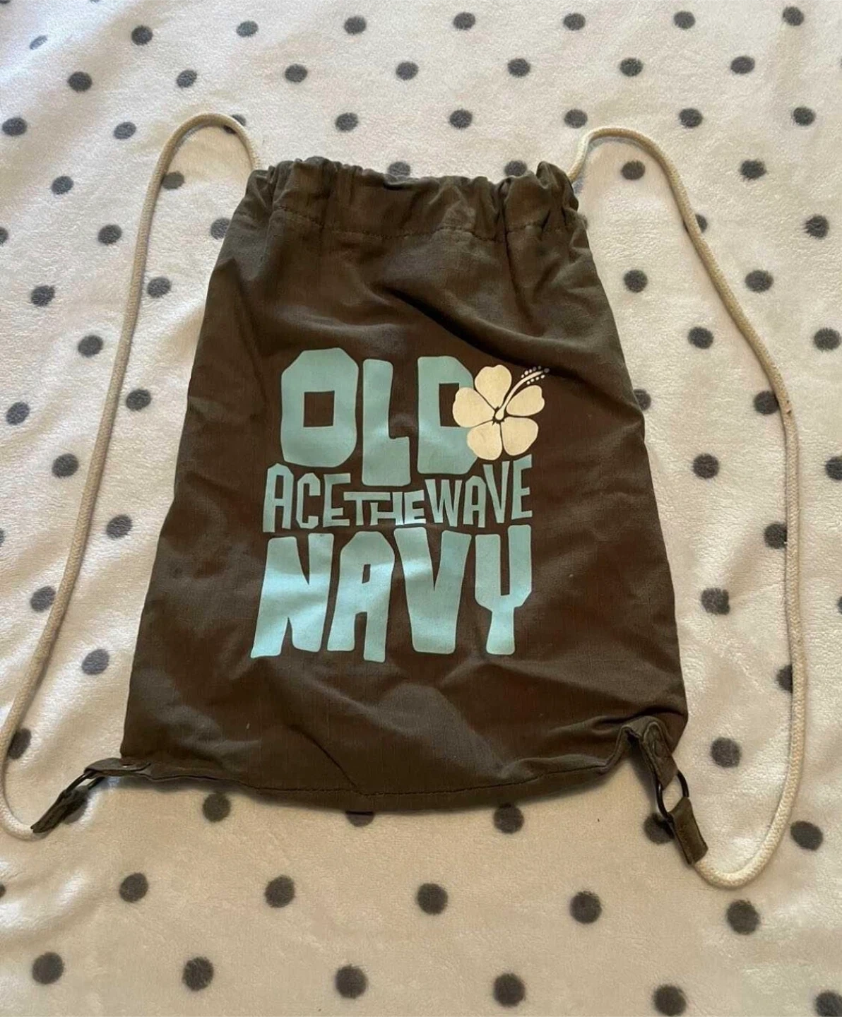 This is an Old Navy drawstring bag with an "Ace the Wave" graphic. It's made of a durable fabric and features adjustable rope straps for comfortable carrying. It's perfect for quick trips to the beach or gym!