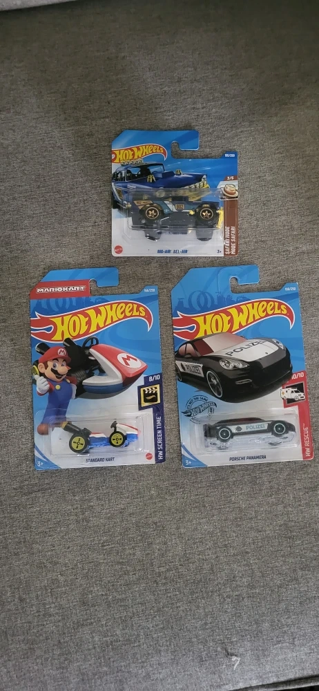 Three Hot Wheels die-cast cars: a Mario Kart Standard Kart, a Porsche Panamera police car, and a blue 'Big-Air Bel-Air'. These are collector's items for car enthusiasts!
