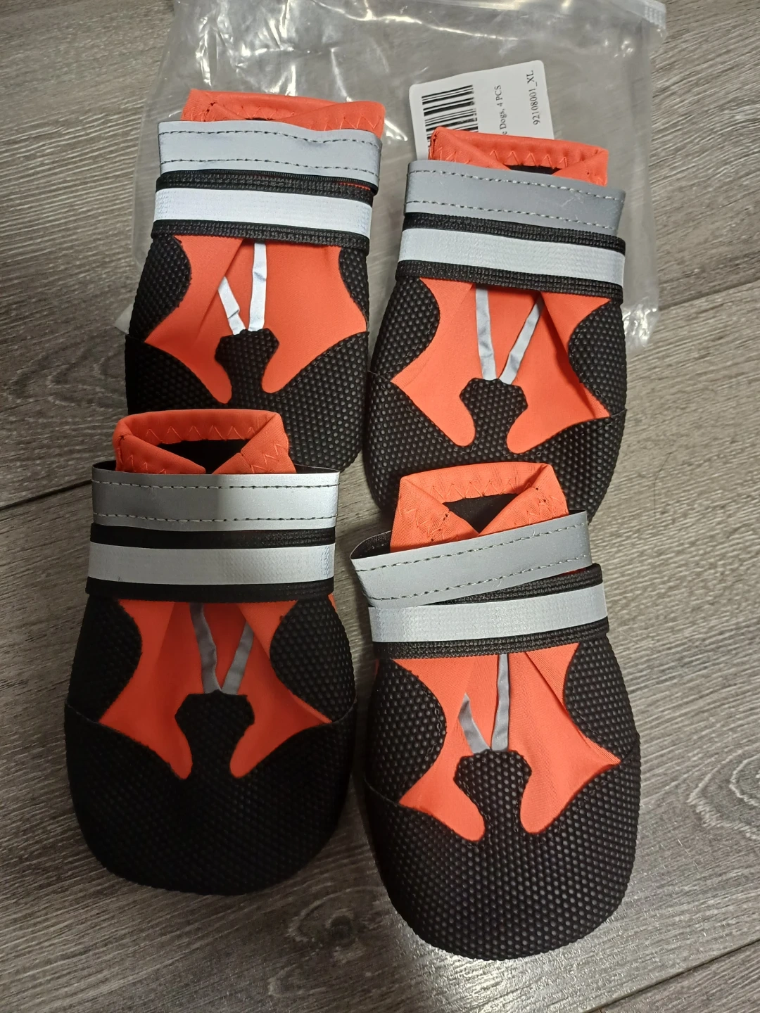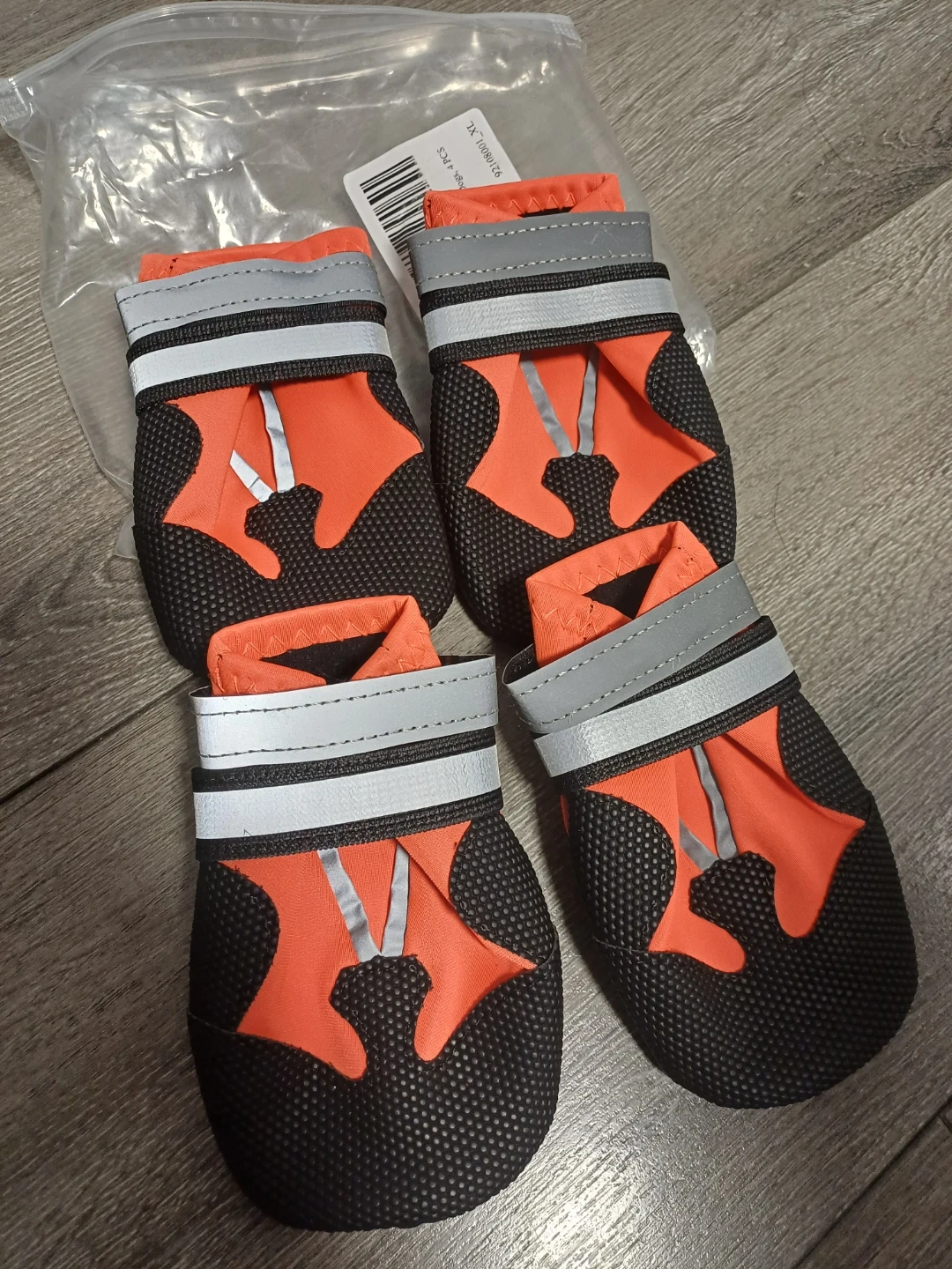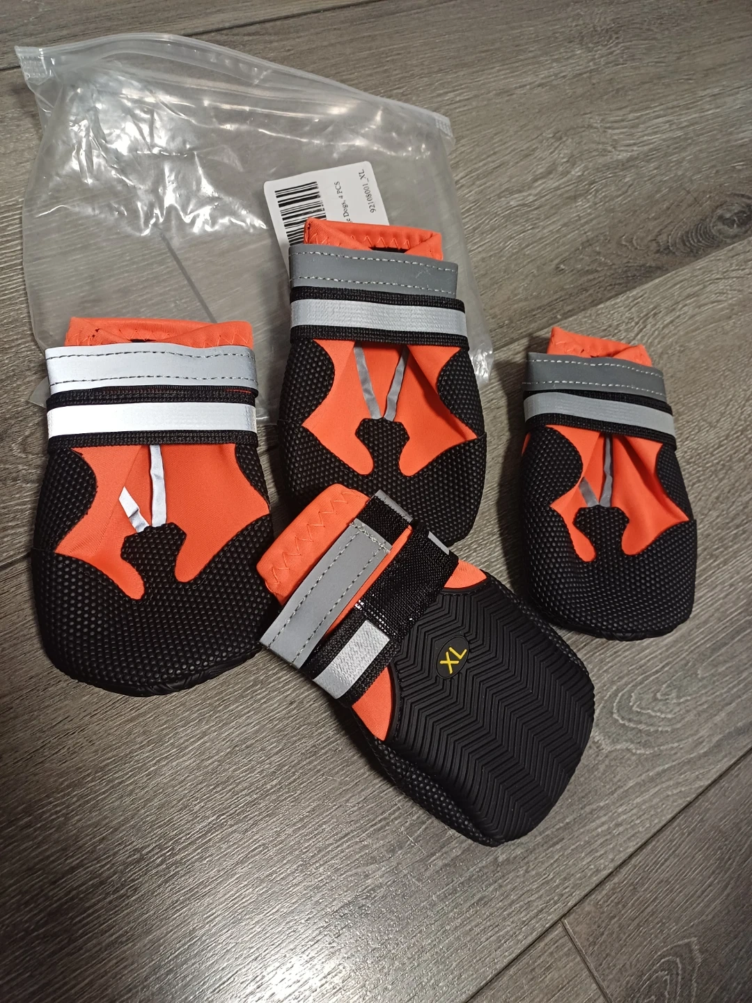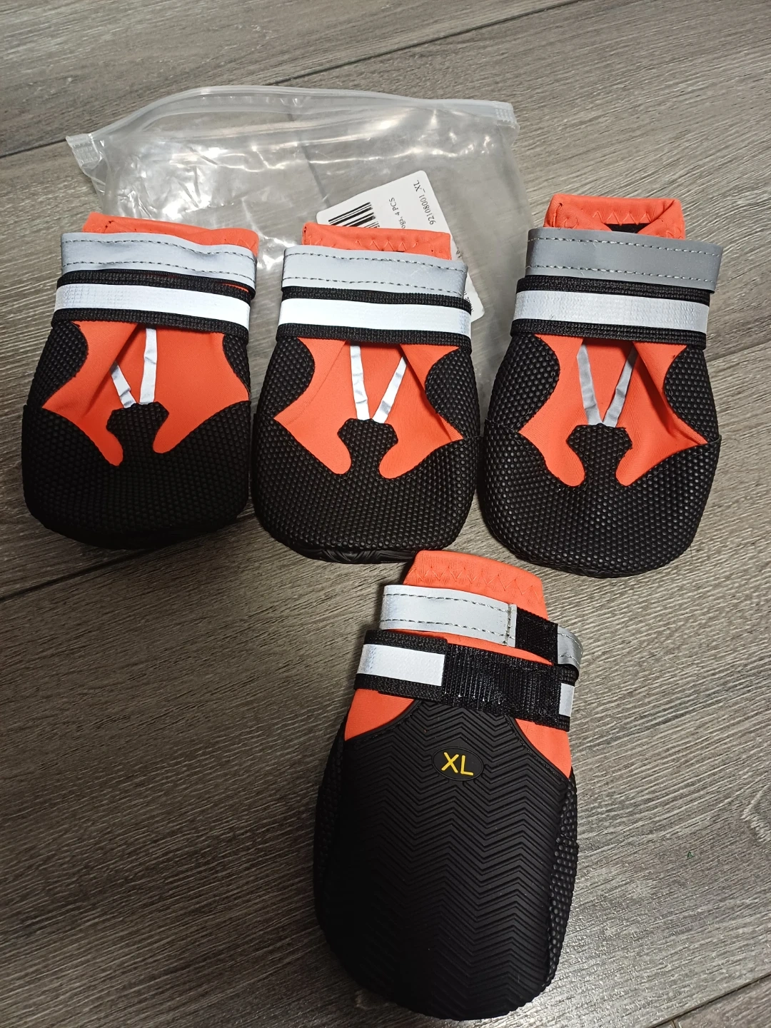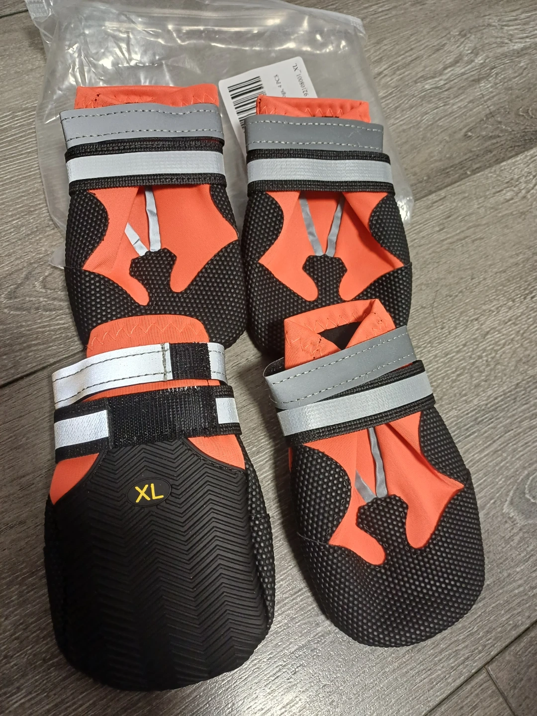 These brand new water proof dog boots comes in a set of four and are size XL. They're orange and black with reflective strips and adjustable straps. The soles are black with a textured grip pattern.