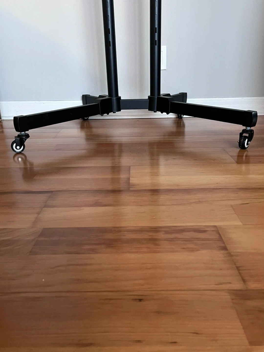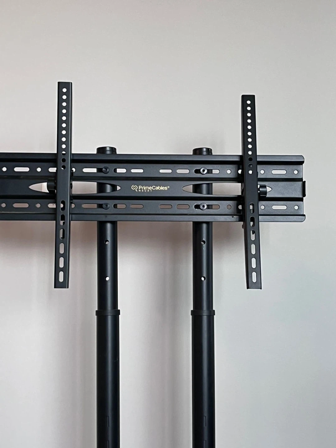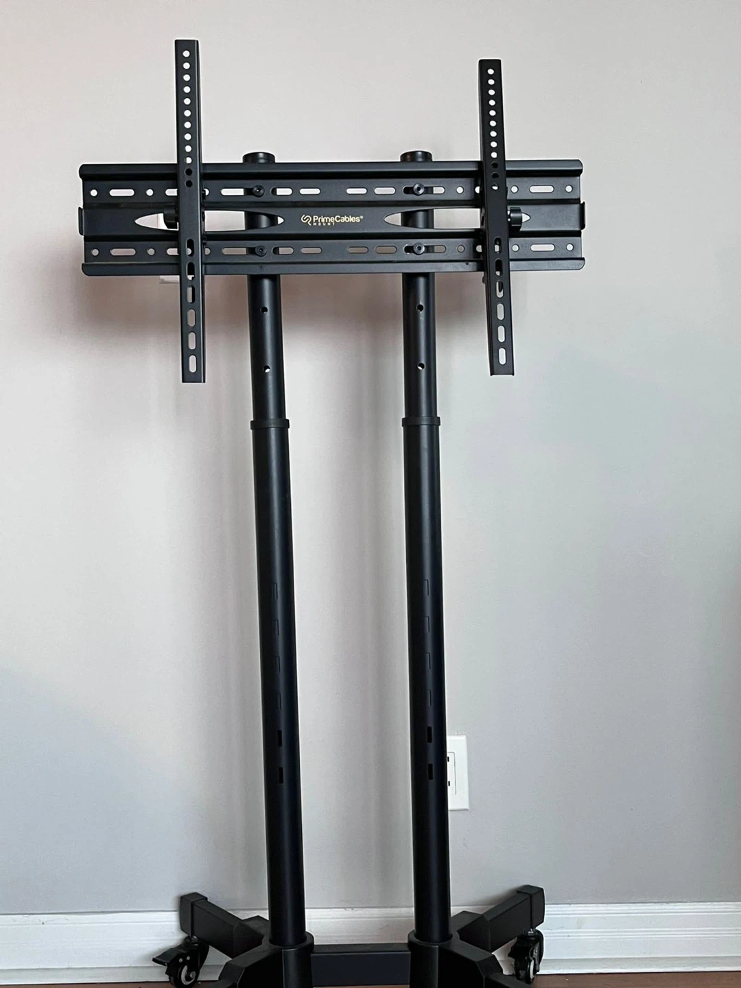 This is a rolling TV stand by PrimeCables. It's black and made of metal. It has wheels for easy mobility. This stand is great for moving your TV between rooms.
