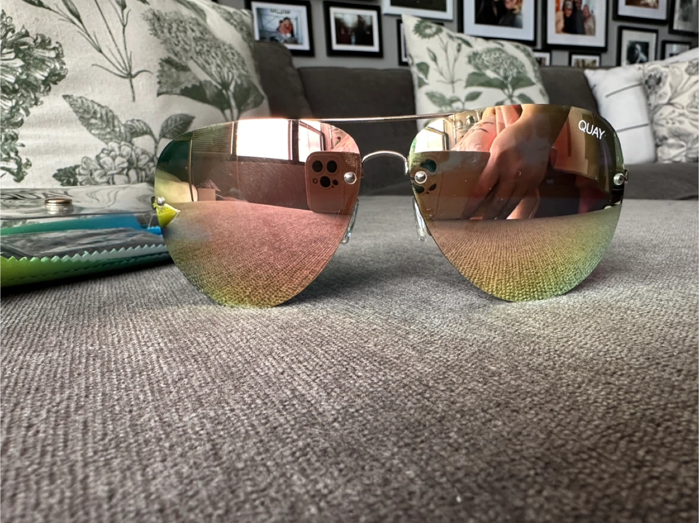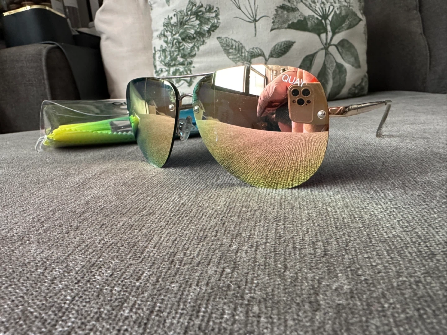 NEW, never used Quay mirrored aviators. The lenses have a pink/gold tint to them. Brand print on left lens. Price tags still on. Comes with sunglasses carrier and 2 new lens cloth. From a smoke free pet free home. Priced to sell, cash only, and pickup only please. I am in Lakeview East by Belmont and Broadway.